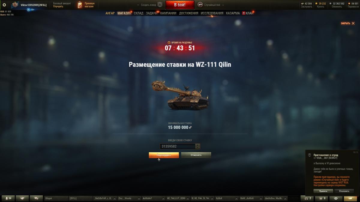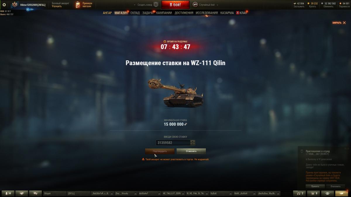 Всем привет! Сегодня в 19:00 по МСК был выставлен на аукцион WZ 111 QL. Я ради этого танка продал 5 машин десятого уровня, множество оборудования и бесчисленное количества расходников, а также долго сидел за фармом серебра на премах. Таким образом я накопил более 32 млн серебра. Всё это было ради WZ 111 QL. Сегодня я хотел сделать ставку чуть более 31 млн (точнее 31359582 серебра), но при нажатие кнопки "подтвердить" внизу появляется сообщение "Твой аккаунт не может участвовать в торгах. Не жадничай". Да, у меня нету ни одного топа китая, но я более часа смотрел все возможные видео, новости, форумы и т. д. по поводу чёрного рынка, ничего не сказано про ограничения продаж из-за прокачки техники. От сюда возникают вопросы - 1) Почему я не могу сделать ставку, когда у меня достаточно игровой валюты? 2) Что мне делать? (Я уже обратился куда только можно, остался только форум) 3) Если я не смогу поставить ставку, возможно ли получить какую-то компенсацию, например вернуть все танки,расходники и оборудку по цене продажи? Прикладываю скрины для достоверности информацииhttp://cdn-frm-eu.wargaming.net/wot/ru/uploads/monthly_03_2021/post-64498889-0-14219600-1614966489_thumb.jpghttp://cdn-frm-eu.wargaming.net/wot/ru/uploads/monthly_03_2021/post-64498889-0-60481200-1614966495_thumb.jpghttp://cdn-frm-eu.wargaming.net/wot/ru/uploads/monthly_03_2021/post-64498889-0-27407500-1614966503_thumb.jpg