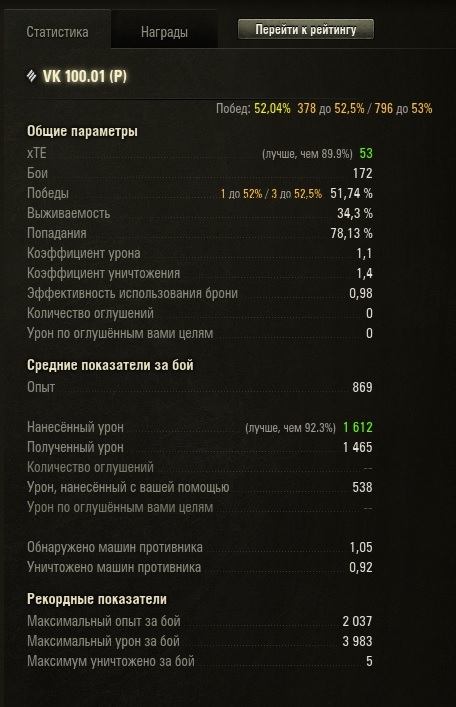ну во общем прошел я этот танк, топ двиг даже ставить не стал, т.к. толку от него считай что ничего по итогу на момент исследования подмышки ПП52% (в процессе прохождения плавал от 30 до 60) средний урон 1612 (в процессе прохождения макс был 1850) за 172 боя 11 стальных стен + 2 отметки на стволе и рейтинг в топ 1000 если бы не нынешний рандом с турбо боями по 3-5 минут, показатели были бы лучше
