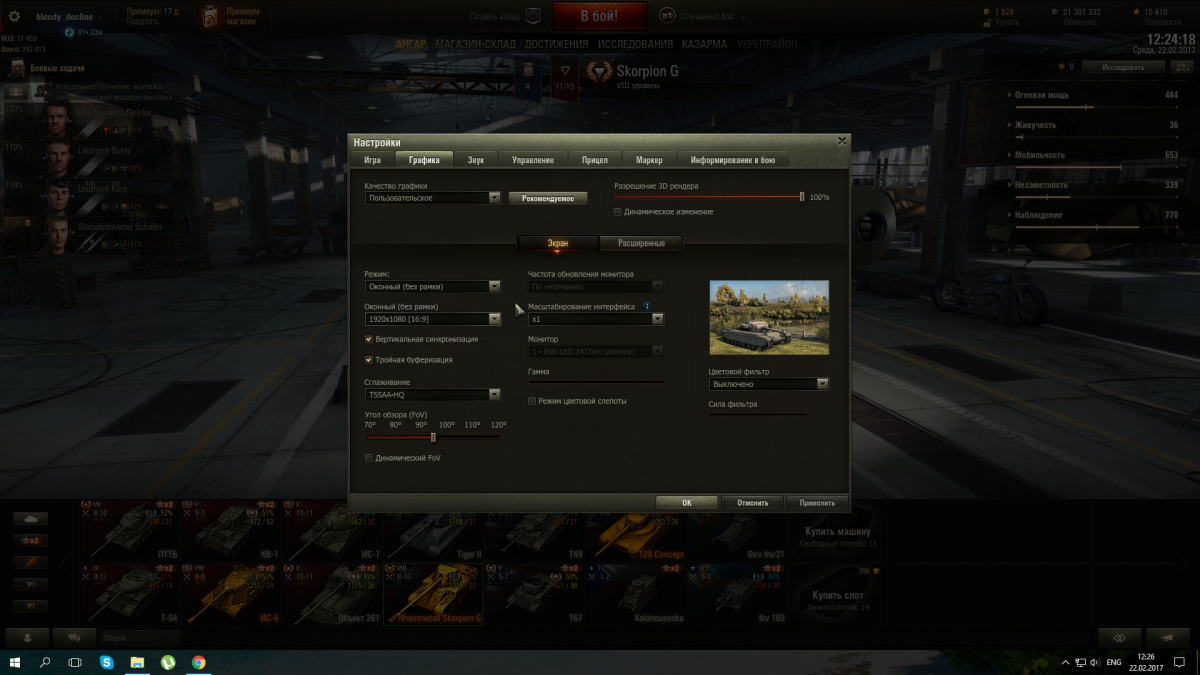 Раньше при режиме "оконный (без рамки)" игра была на весь монитор, т.е. 1920х1080. После сегодняшней обновы снизу есть панель задач винды (прикрепляю скриншот). Получается, что теперь разрешение у игры 1920х1040. Как сделать, чтобы при режиме "оконный (без рамки)" игра была на весь монитор? Заранее спасибо! http://cdn-frm-eu.wargaming.net/wot/ru/uploads/monthly_02_2017/post-6465255-0-71535700-1487752214_thumb.png
