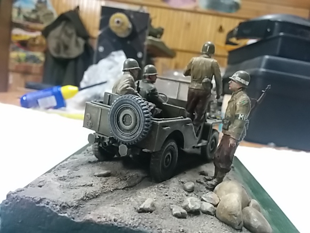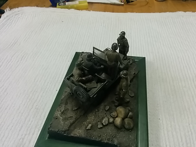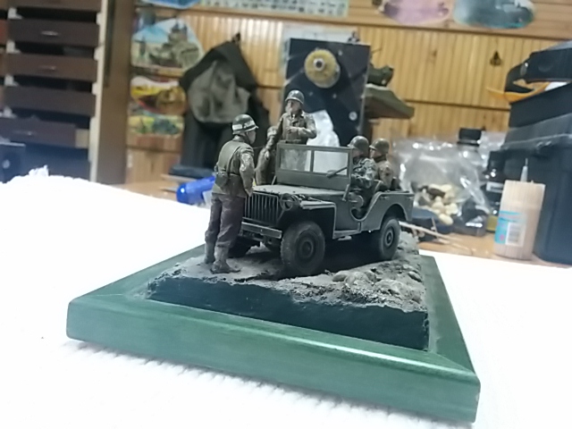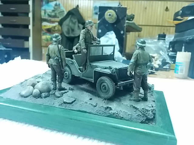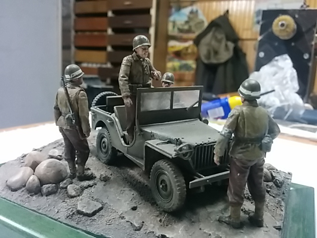 Добрый день. Выставляю на показ виньетку. Фирма Миниарт. американский джип с экипажем. Модель "из коробки". Основание песок камни. Приятного просмотра.
