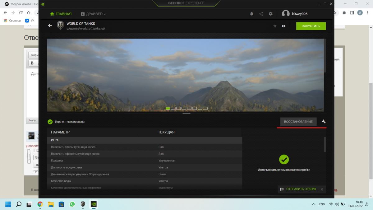 Скорее всего именно через неё у тебя оптимизированы настройки танков и поэтому у тебя сбиваются настройки. Зайди geforce experience, нажми на шестерёнку, найди вкладку игры и приложения и убери галочку с автоматически оптимизировать недавно добавленные игры или приложения