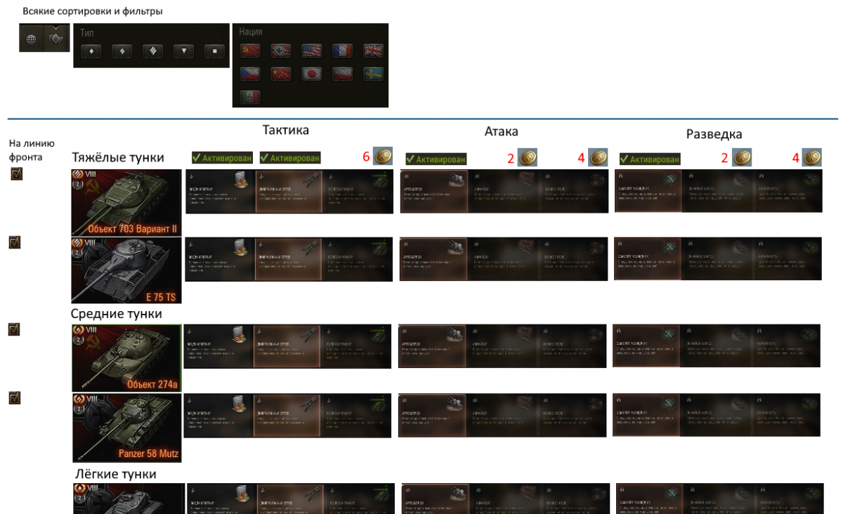 Суть проблем вкратце: При настройке существующих резервов, при разблокировке новых резервов и последующем их назначении на кучу - штук 30-40 танков - кликать по этой куче и каждому кликать на его текущий резерв, а потом кликать на выбор нового резерва - это капец как долго, нудно и неудобно. Часть танков не нужна на ЛФ, их надо заблокировать, чтобы не мешались при выборе нового танчика во время боя. Решение вкратце: использовать групповое редактирование. Примерная иллюстрация решения - на прикреплённой картинке. Чуть подробнее об элементах UI на иллюстрации: Сверху сортировки и фильтр. Умолчальная сортировка - по классам техники. В списке ниже видно, что техника разбита на группы, и каждая группа - это класс. При сортировке по нации, например, техника будет группироваться по нации. Слева галочки, обозначающие, следует ли этот танк выкатывать на ЛФ. Чтобы отсечь всякий неинтересный мусор, чтобы он не мельтешил на экране выбора техники во время боя. Справа от каждого танка - выбор резервов на него. Всё на виду, не надо кликать на каждую машину, чтобы узнать, что на ней установлено. Можно очень быстро прокликать нужные резервы, если потребуется их сменить. Сверху над каждым типом резерва имеется кнопка-монетка разблокировки: разблокируй - и сразу накликивай на нужные танчики. Наверняка у вас в админке сайта, в админке форума есть списки новостей, тем, сообщений, и рядом с каждым элементом - кнопки, нажимая на которые можно что-нибудь делать с этим элементом, не заходя в его подробный просмотр - и это удобно. Я предлагаю примерно то же самое, только с интерфейсом танков. По-одному их редактировать во многих случаях ну очень неудобно.