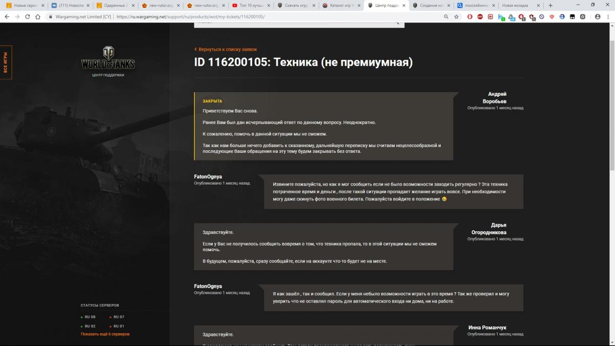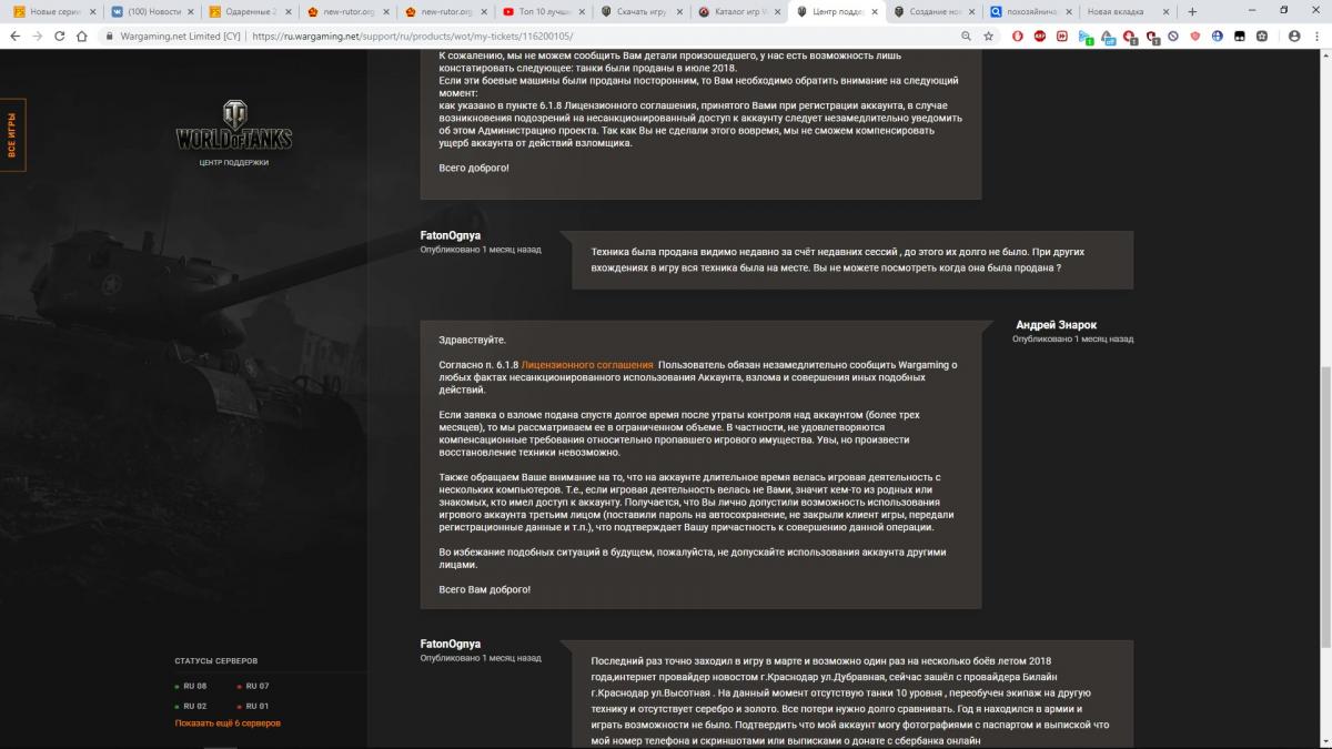 Дорогие товарищи , во время моего нахождения в армии , всё же удавалось зайти на свой аккаунт несколько раз , а под конец службы и доступ появился к интернету , но к моему большому разочарованию на аккаунте кто-то похозяйничал. Продана техника 10 уровня, куплена фан техника (типо кв-2) ,переобучен бездарно экипаж , некоторый уволен , потрачено серебро и с многой техники продано оборудование.Как нормальный человек , я сразу же обратился в службу поддержки , но их ответ меня удручил(((( Я должен был сразу сообщить об взломе , но если учесть что я в армии и с мая-июня не было возможности играть а вакханалия началась с их слов с июля и продолжалась долгое время пока я не увидел данный факт и не поменял пароли. Неужели администрация не может пойти никак на встречу ведь исходя из п. 6.1.8 Лицензионного соглашения( Пользователь обязан незамедлительно сообщить Wargaming о любых фактах несанкционированного использования Аккаунта, взлома и совершения иных подобных действий ) я сообщил незамедлительно как увидел факт взлома и сразу же его присёк. Кто сталкивался с такой проблемой или может помочь , пишите буду рад вашим предложениям P.S. Прилагаю фото с центра поддержки и подтвердить что аккаунт мой могу , если надо скину фотки с армии)))