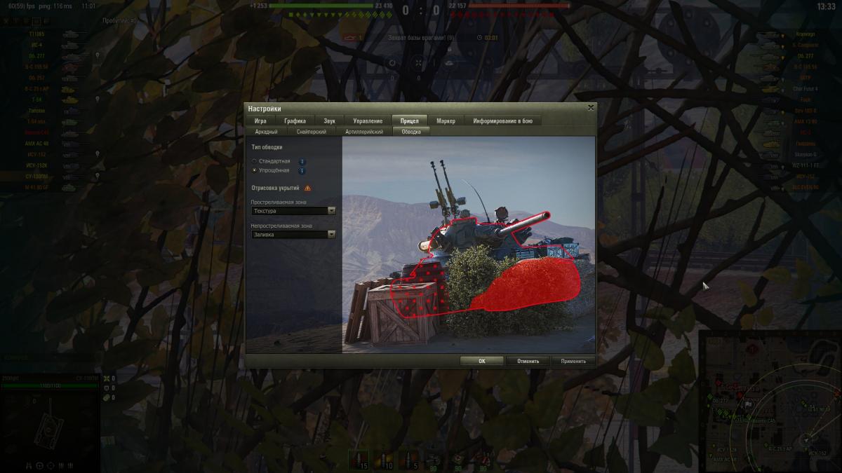 В продолжение темы: http://forum.worldoftanks.ru/index.php?/topic/2153300-%d0%b7%d0%b5%d0%bb%d1%91%d0%bd%d0%b0%d1%8f-%d0%be%d0%b1%d0%b2%d0%be%d0%b4%d0%ba%d0%b0-%d0%bf%d1%80%d0%be%d1%82%d0%b8%d0%b2%d0%bd%d0%b8%d0%ba%d0%be%d0%b2/page__p__55559914 После обновления игры до версии 1.16.1.0#1205, остались проблемы с обводкой. При настройках как на скрине Силуэт противника над препятствием не обводится вообще ничем