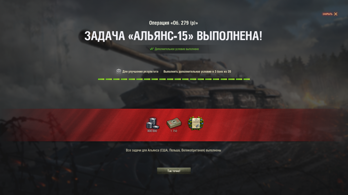 Боже наконец то я выполнил Альянс-15 с отличием, сделал как и советовали тут на Т28 прототипе, последний бой просто нечто, жаль не получилось до конца затащить До этого пробовал на Бадгере, М60, но ничего не получалось, потом начал на бульдоге, но играть на нем просто невозможно. Хочу дать советы тем кто еще проходит эти ЛБЗ, чтобы так сказать из первых уст Альянс-3 Если вы как и я соло-игрок, то даже не пытайтесь пройти ее постановкой на каток на каком нибудь Коне, как вы можете на ютубе это где то посмотреть, это полная фигня, только потратите время, покупайте Мантикору и светите, я почти сделал с отличием ее, главное начать нормально с 1 боя, если не получается - каждый раз скипаете задачу и заново, и так по кругу. Альянс-8, одна из самых сложных и не оптимизированных под нынешнюю механику фугасов задача. Много потел ее сделать на ДПМных танках таких как СуперКонь, Бадгер, Карнарвон АХ, М60, Кобра. Потом попробовал как тут советовали на АТ15 с фугасами со сток пушкой, мне вообще не зашло, полная фигня. Наткнулся на ютубе на ролик, где один товарищ прошел задачу на М53 арте, решил тоже попробовать и начало получаться, пробовал и на топ пушке и на стоковой, выполнил в итоге на стоковой, не знаю кто тут пишет что сток пушка на ней с голдовыми фугасами не критует, все она критует. Благодаря арте и выполнил эту задачу, хотя сам терпеть ее не могу, но пришлось руки замарать так сказать Главное используйте голдовые фугасы, это которые без оглушения, ну выбирайте цели по картоннее, и очень важно прямое попадание, сплешем толка никакого. Всем желаю удачи в выполнении, спасибо за помощь, интересно было почитать Ваше мнение)