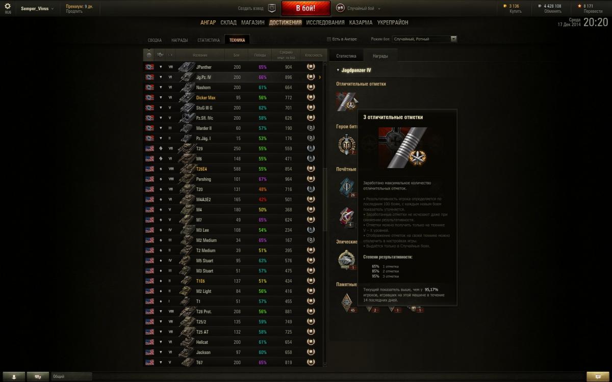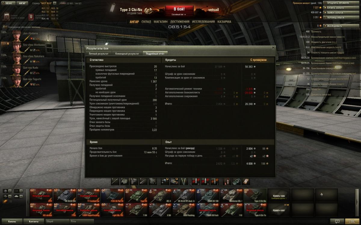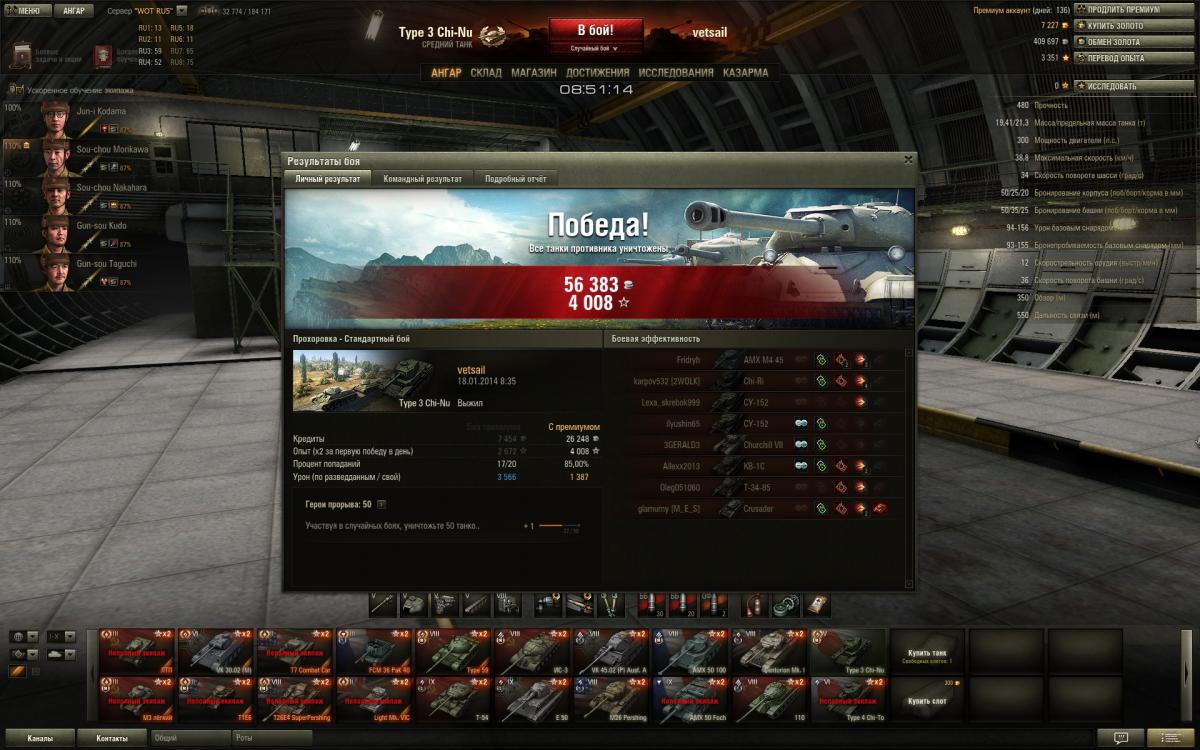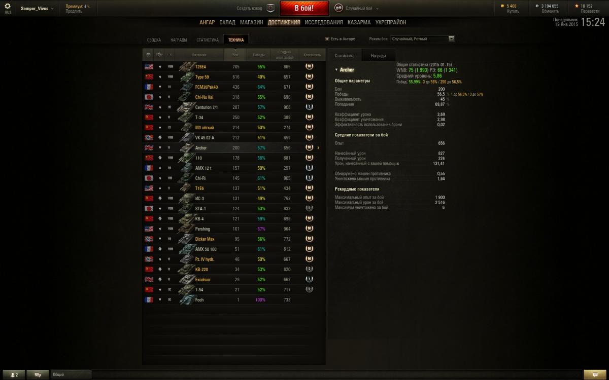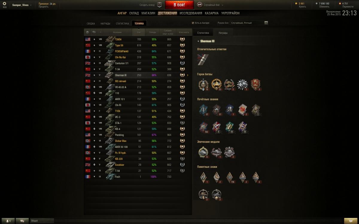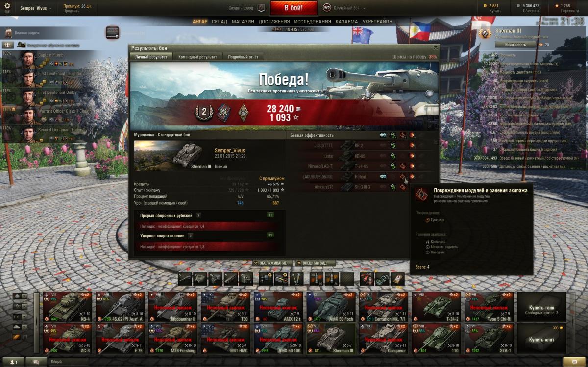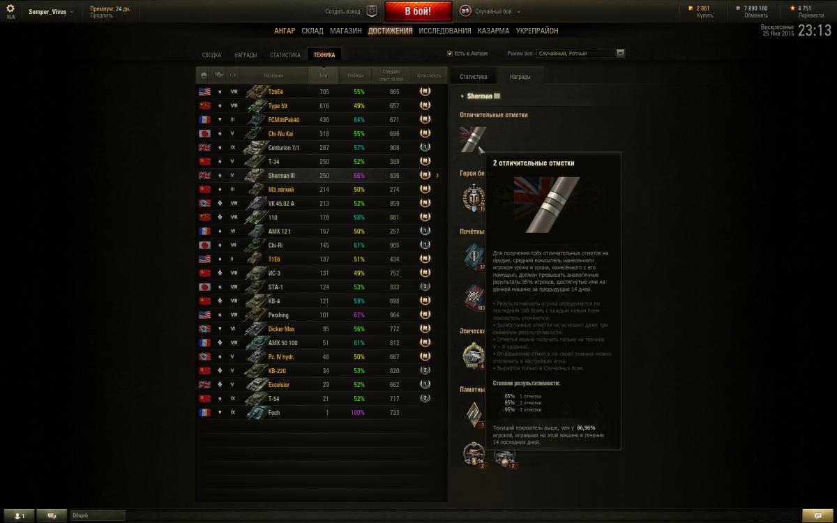 Был отправлен начальством в отпуск, но поскольку денег на путевку в Египет не было, пришлось купить Шерман3, который как раз начал там свой славный боевой путь. Потихоньку за неделю откатал на нем 250 боев (2 с 6 фунтовым дыроколом, остальное на фугаснице). Танк не просто нагибает, танк фановый. 66,4% побед. 13 раз взял Мастера, 4 Редли-Уолтерса, 15 воинов и 2 ачивки на ствол. Танк абсолютно не требовательный к скилу (64,76% попаданий), надо всего лишь сводиться полностью. Пт он гнет так, что они аж плачут бедные. Количество наносимых критов в районе 5 за бой (116 костоломов). Танк не просто убивает, он делает это в извращенной форме, что непомерно радует. Средний урон - 834, фрагов за бой - 2,17 (соотношение убил/убит - 4,27) Танк вери вери гуд.
