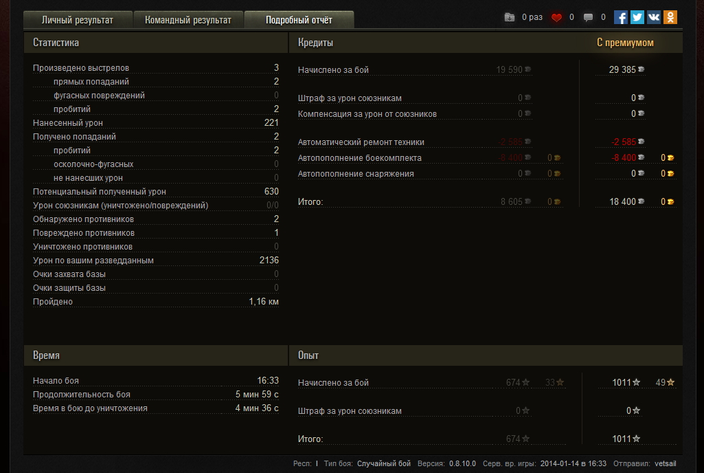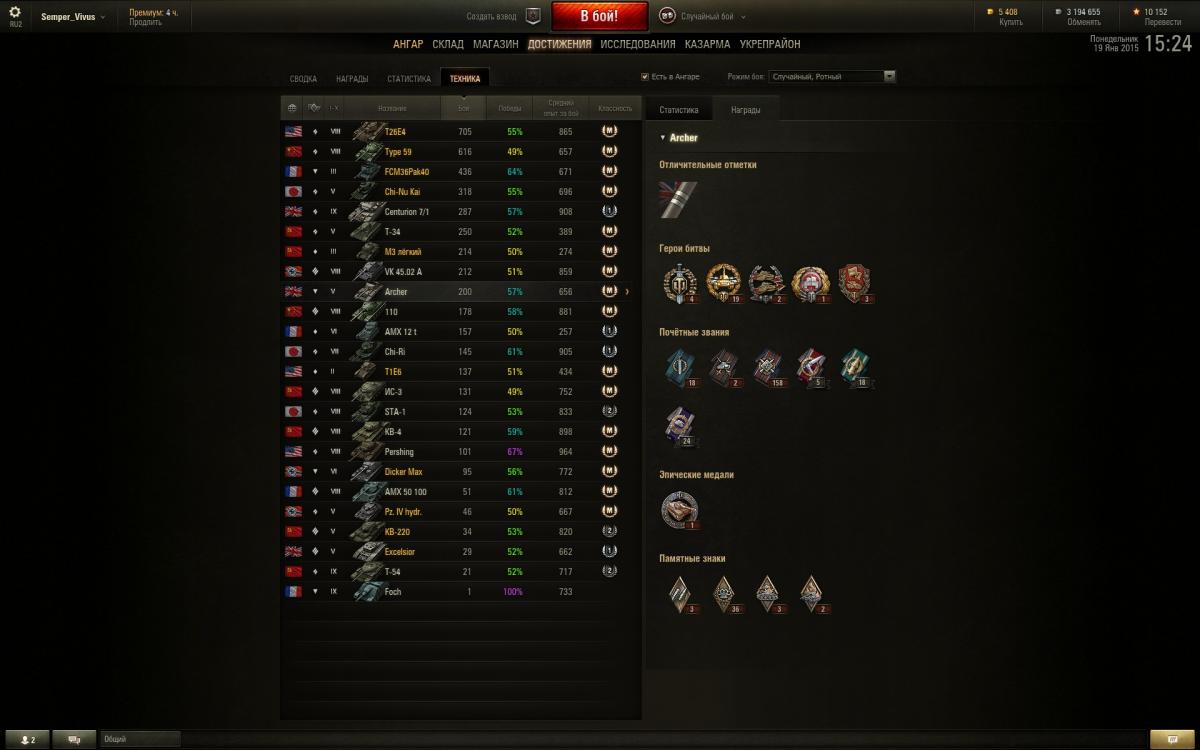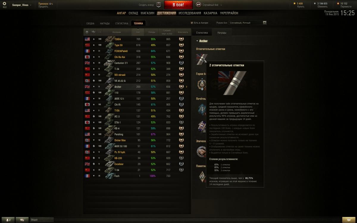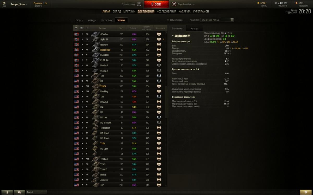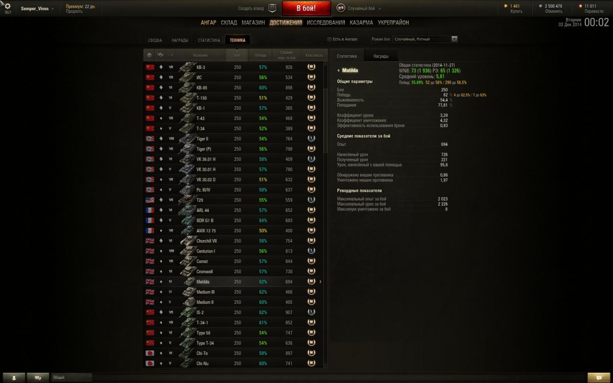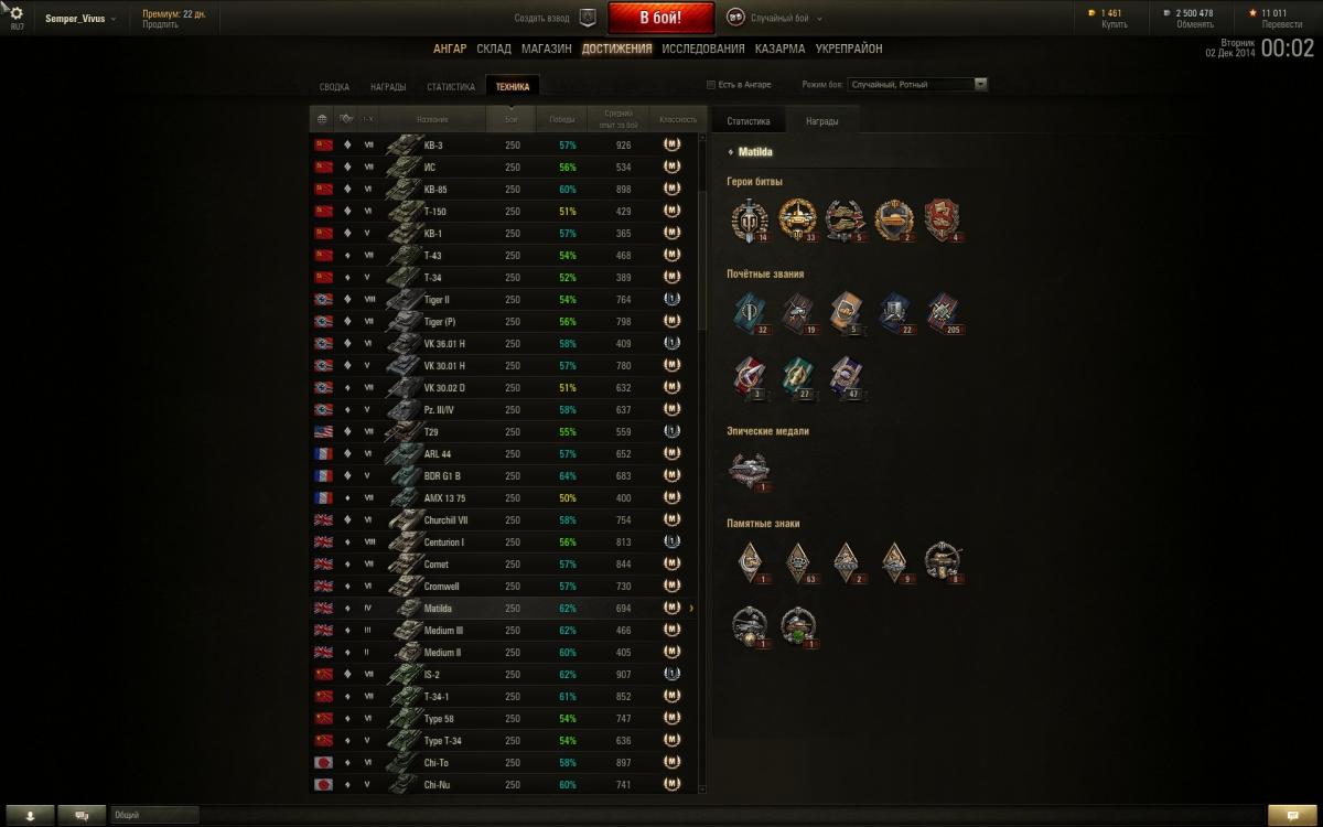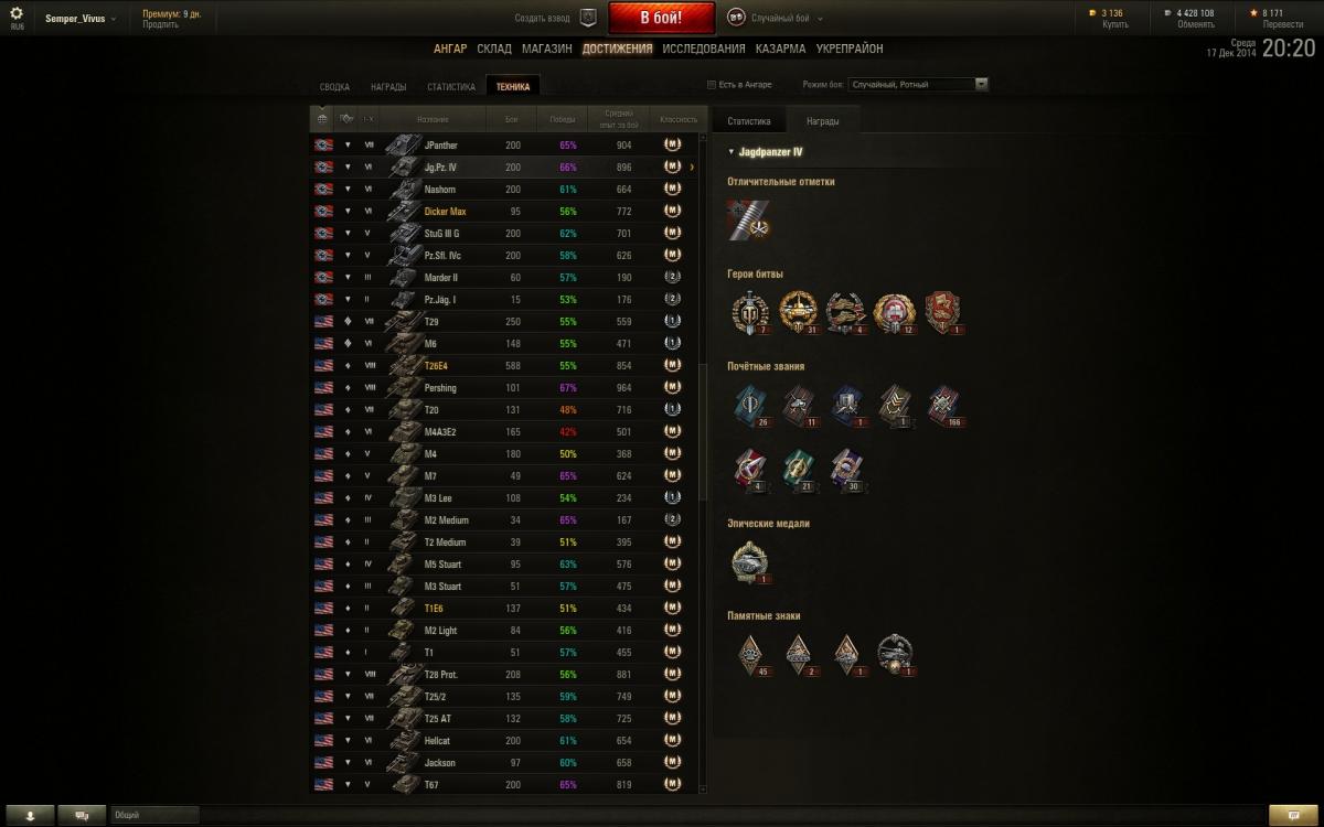 Был отправлен начальством в отпуск, но поскольку денег на путевку в Египет не было, пришлось купить Шерман3, который как раз начал там свой славный боевой путь. Потихоньку за неделю откатал на нем 250 боев (2 с 6 фунтовым дыроколом, остальное на фугаснице). Танк не просто нагибает, танк фановый. 66,4% побед. 13 раз взял Мастера, 4 Редли-Уолтерса, 15 воинов и 2 ачивки на ствол. Танк абсолютно не требовательный к скилу (64,76% попаданий), надо всего лишь сводиться полностью. Пт он гнет так, что они аж плачут бедные. Количество наносимых критов в районе 5 за бой (116 костоломов). Танк не просто убивает, он делает это в извращенной форме, что непомерно радует. Средний урон - 834, фрагов за бой - 2,17 (соотношение убил/убит - 4,27) Танк вери вери гуд.