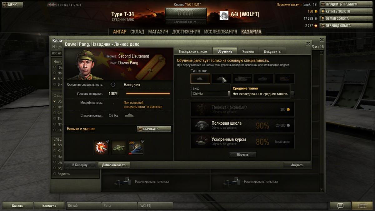Здравствуйте, уважаемые игроки! Моя проблема заключается в том, что я не могу пересадить наводчика с Чижыка на Тип Т-34. Экипаж с Чижыка высадил в казарму, купил Т-34, пересадил всех, кроме наводчика. Наводчик лентяй - не хочет освоить новую технику. Я удивлен и разочарован одновременно. Надеюсь на вашу помощь. Заранее благодарен.