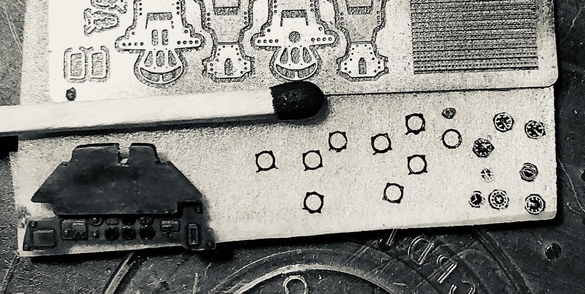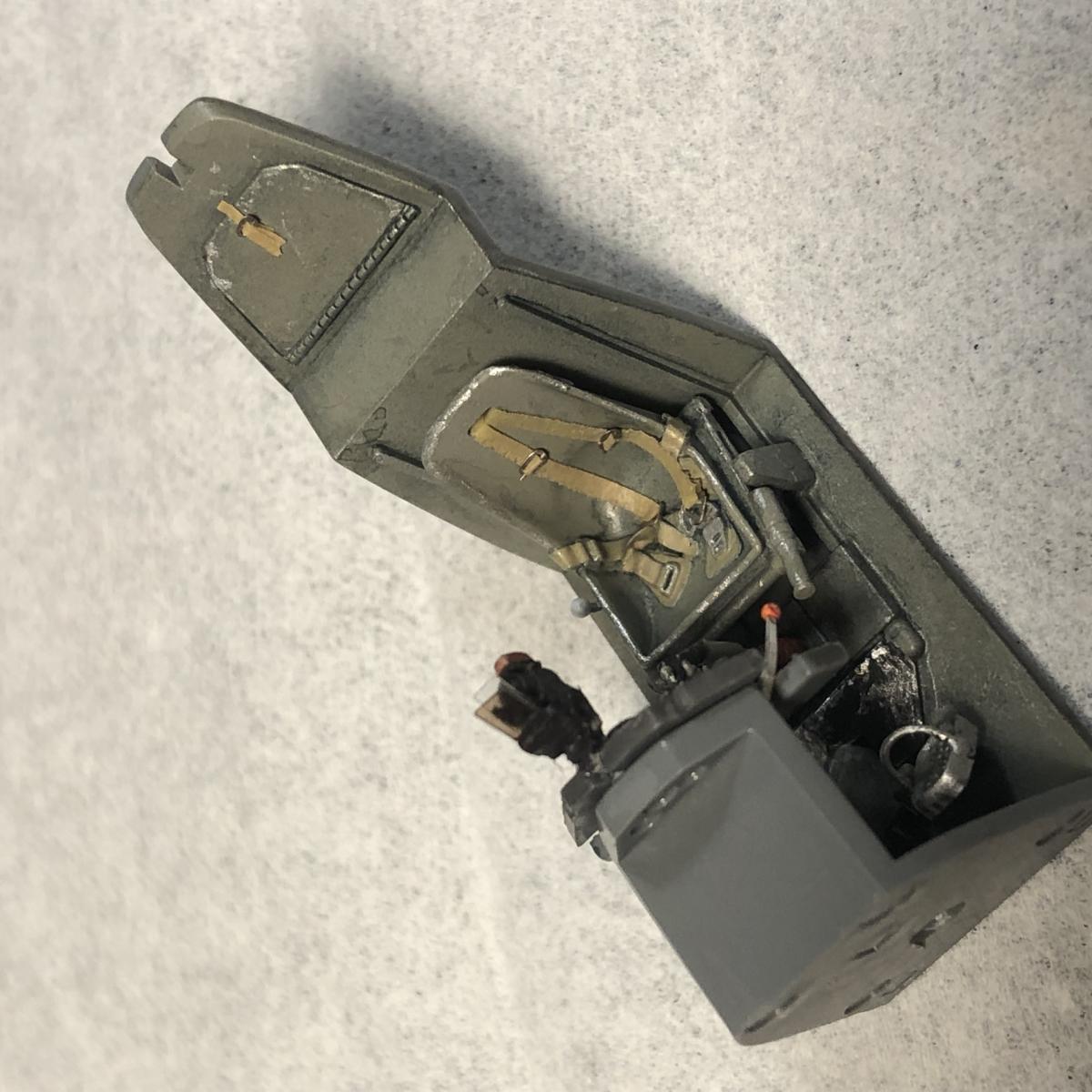 Да, мне почему то кажется, что гораздо сложнее сделать модель подбитого, сгоревшего танка. Слишком много мелочей нужно учитывать, реализовать каким то образом гарь, копоть, мелкие разорванные детали. Да тьма, чего только нужно... Абсолютно верно. Модель собиралась быстро только на первоначальном этапе. Дальше все шло очень медленно, сверка с фото, детали не хотели приклеиваться, отламывались. Маски на все повреждения, потом вместе с деталями снимались. Часть деталей в результате на модель не поставилась (мелочь от инструмента, вывернутые провода, крепления и и.д.), надо было выбирать-долгострой и перфекционизм, или законченная модель! Победило второе!