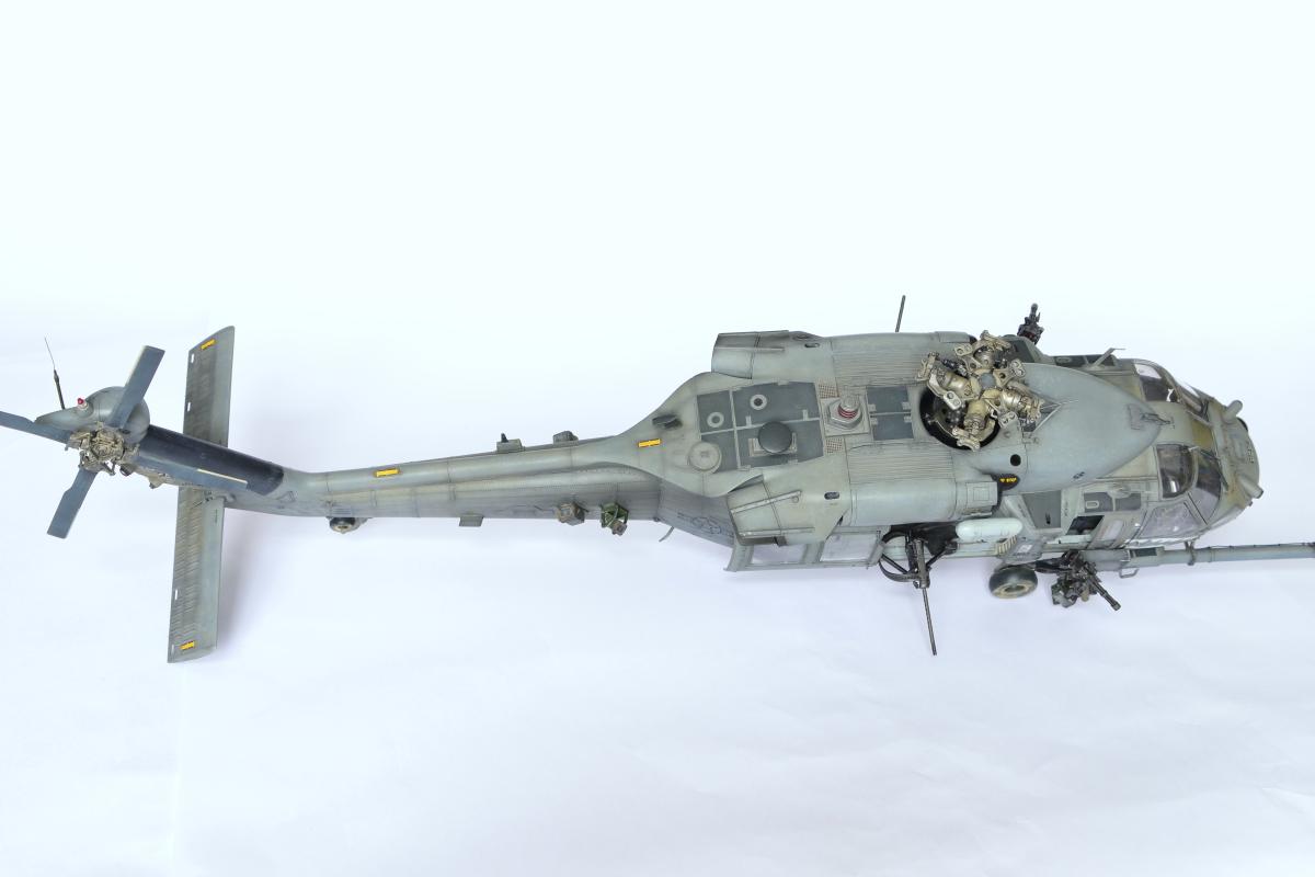 Модель производства Kitty hawk в масштабе 1/35. Вертолетом заинтересовался после просмотра фильма "Черный ястреб". Несмотря на то, что там другая модификация, вертолет достаточно красив внешне и в тоже время имеется изящное вооружение, доступен афтемаркет. Заменены: пулетемы и патронные ящики на внешних подвесках на смоляные, пулеметные ленты на резиновые. Огромное количество фотографий позволило подобрать интересные способы окраски, возможность поработать с прешейдингом (синий и черный цвет). Трещины на передних стеклах были нанесены специально для дальнейшей работы - модель будет использована в другом проекта, более масштабном - в качестве одной из моделей диорамы.