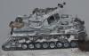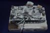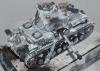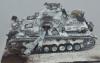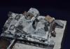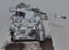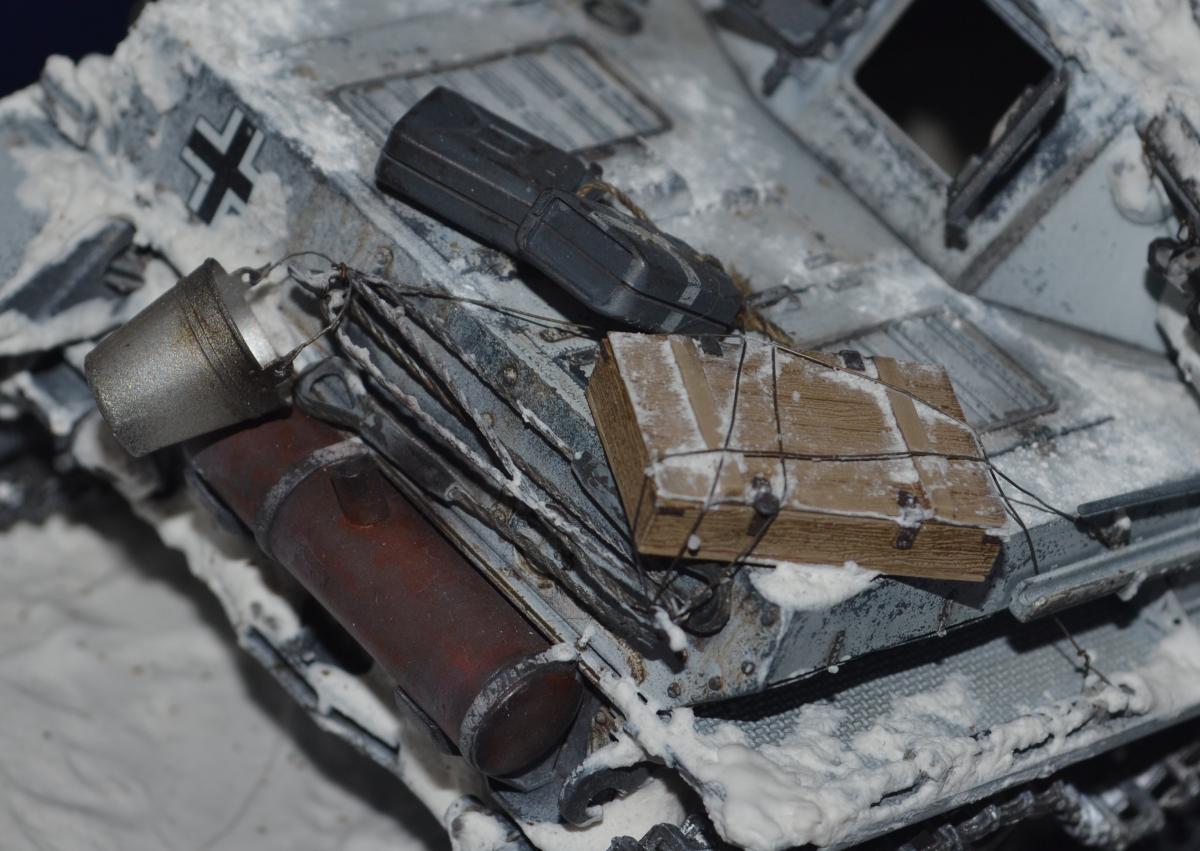 На самом деле, достаточно сложный проект. Кроме перечисленного, сам снег, камуфляж ещё усложняют работу. Если модель я крашу, наношу везеринг 2-4 дня, то на эту ушел целый месяц. Новая химия, пасты, сначало делал на пробниках и ждал сутки-двое. Например, снег Wilder вроде классный, со временем (через неделю) стал желтеть. При усыхании стал походить на мелкую губку. Пришлось добавлять местами снег от АК, а он совсем другой. В общем, результат мне был не известен до самого последнего момента. Но в целом, я доволен. Ещё, намучился уже из-за своих косяков-красилась 2раза (в цвет серого не попал). Потом химия (лак для волос) АК почему -то не сработала и белый на водной основе прилип намертво: 5 часов я его драл всем, что попадется под руку! Даже одежной щеткой, которой грязь со штанов счищают, макал щетки в кипяток, бесполезно. Хотел уже выкинуть. Потом отложил до следующего дня. На следующий день взял спонж, серую краску и нанес сколы поверх белого. Вся мелочевка, инструмент красились отдельно и приклеивались уже на окрашенную модель. Вид был здоровский, все с цветовой игрой получилось, и траки, и ломы, и лопата. А потом сердце кровью обливалось когда сверху все закрылось снегом! Но как говорится- искусство требует жертв!