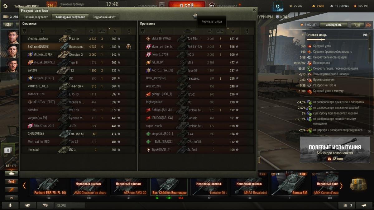 Прошу Хпердов посмотреть этот реплей, и высказать свое мнение. Если бы на моем месте был фиолет статист, ну, например, Сенокос, можно ли было его вытащить на победу? Я сдох слишком быстро, еще и не ожидал, что карту в обнове перекопали, поэтому сверху смотрел на пару союзных тт. Обычно такие бои доигрывать у меня желания нет, и я выхожу еще до своего уничтожения, в целях экономии времени на игру, но тут решил поцарапаться. Итак, действия союзного ис-3, который стоял на полке и видел, что снизу едет скорп и неминуемо его засветит рентгеном, и ему тут же прилетит с фланга с 5-6 стволов? У игрока 36 к боев, он должен это знать. Скорп, кста, уверовал в свой скил, и был потушен мной с двух фугасов. В конце боя тт, который танковал бортом под 90 градусов и стрелял с автоприцела по чарфутюру? Уверен, что союзников 12 в этом бою играли аналогично. Так вот, смог бы другой игрок вытащить этот бой? Я, если бы старался чуть больше, возможно, настрелял бы не 2к а 4к, но результата это не изменило бы. И какой будет ПП у скиловика, если все его бои будут подобными? 9 серв, там легко взять 3 отметки, да?