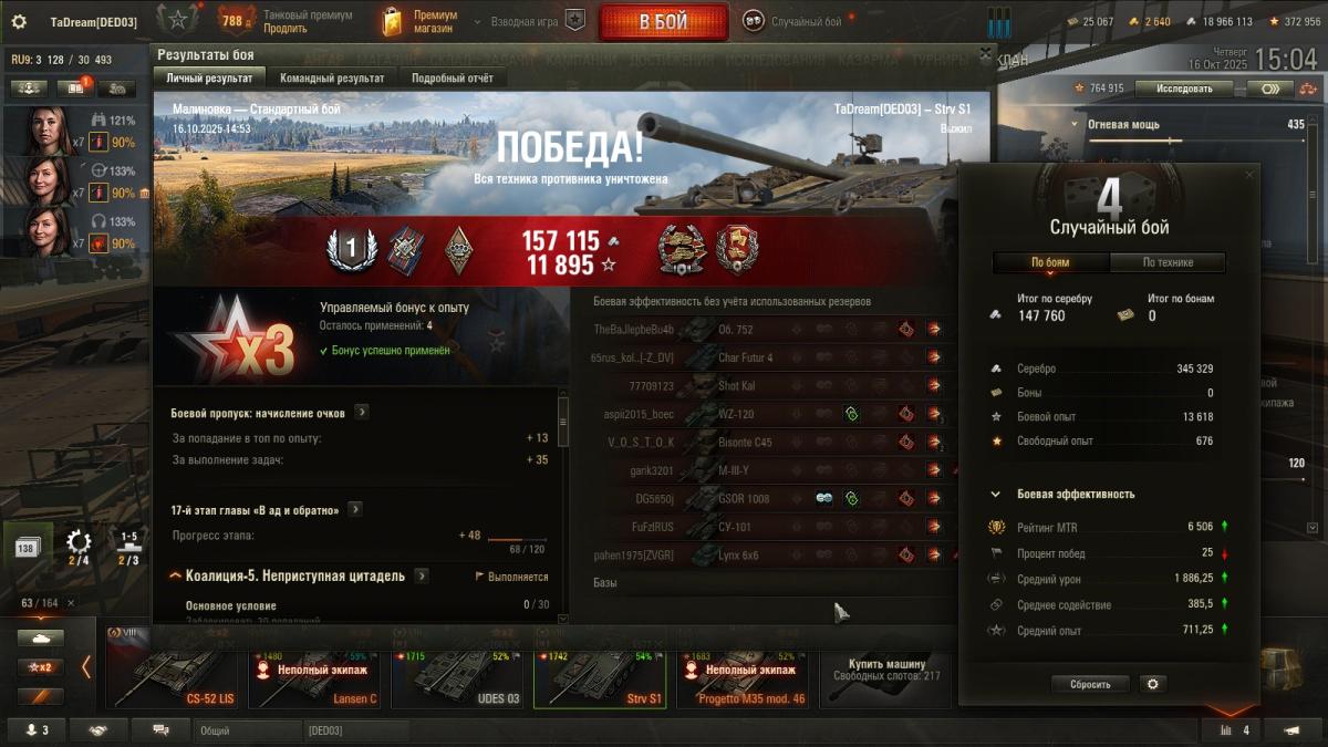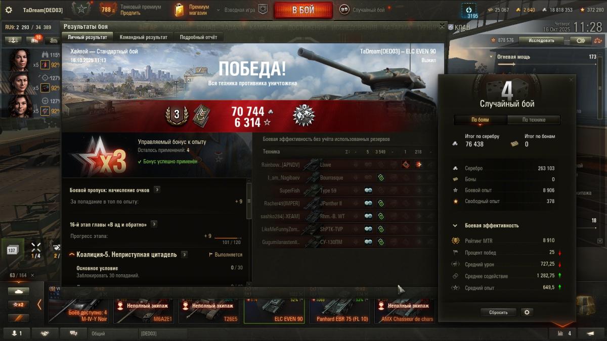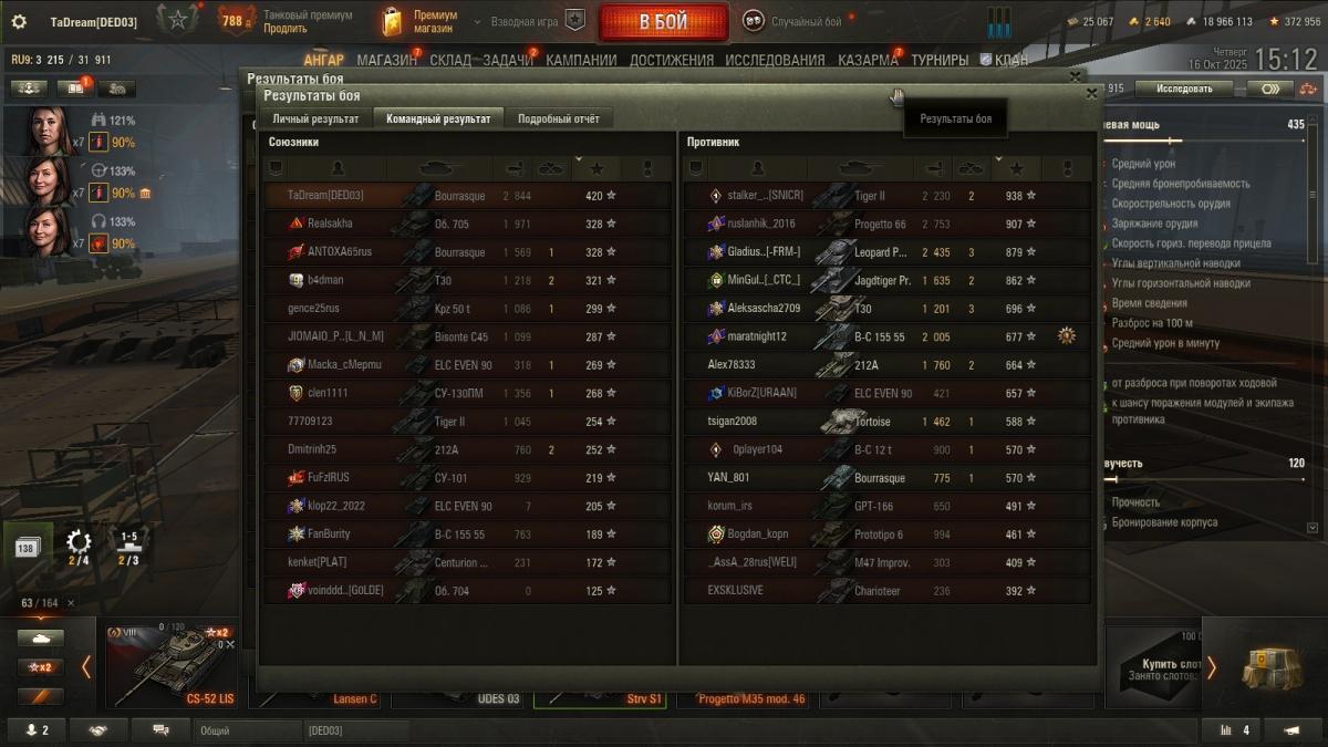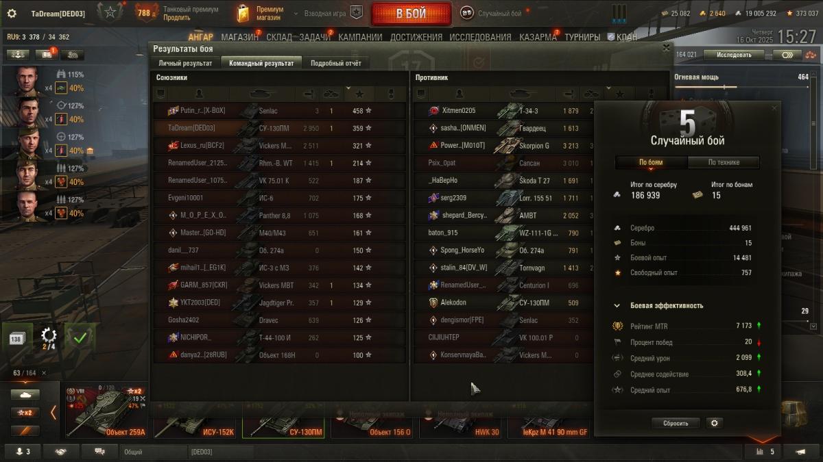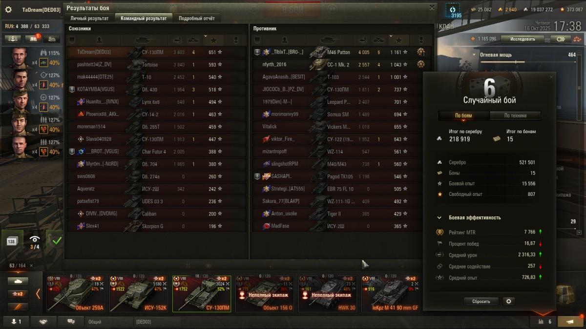 Чтобы быть более объективным, сегодня случился бой 15-2. И даже не знаю, что лучше- настрелять много и продуть, или турбач и ничего не успел сделать) Часто, слишком часто вижу ботов, игрокам похх, не боятся катать роботов. Но и напротив если, весело их раскатывать. Хотя и не так интересно, как раскатать какого- нить скиловичка. Формула 1-15 сегодня не сработала, началось утро с побед P.S. Впоследствии ПП выровнялся, но вектор эффективности остался. Такие катки мне по душе)