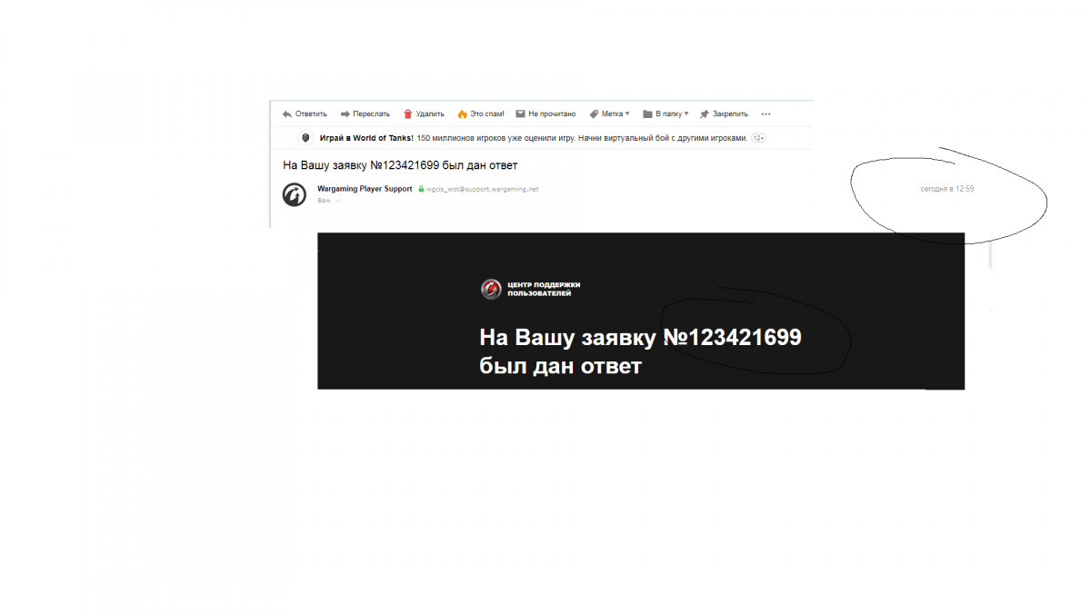 http://cdn-frm-eu.wargaming.net/4.5/style_images/wg/snapback.png9l_Megera (06 апр 2020 - 11:49) писал: Ещё раз: на втором скрине у вас зачем-то центр уведомлений. Зачем вы его скрините, я хз. Вопрос: если зайти в ЦПП и ткнуть кнопочку "мои заявки", что там отображается? http://cdn-frm-eu.wargaming.net/wot/ru/uploads/monthly_04_2020/post-4336410-0-92933300-1586173760_thumb.png НИ ЧЕГО! в том то и дело! техподдержка пишет ответьте! вот и суть проблемы куда!? Скрины то что на почту приходят уведомления а в лк нет!