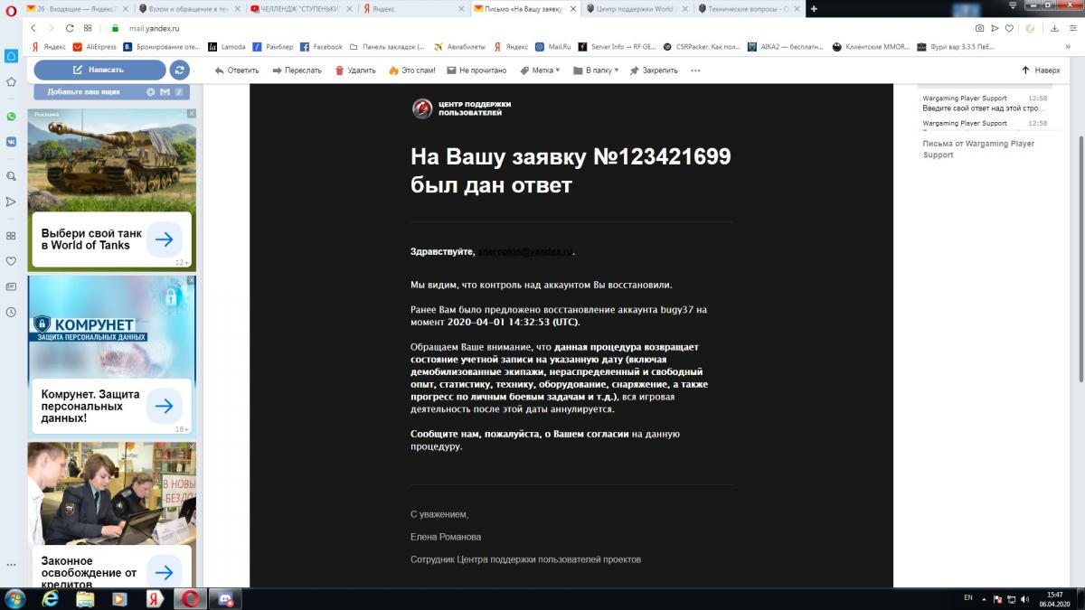 http://cdn-frm-eu.wargaming.net/4.5/style_images/wg/snapback.pngNEVEGDA (06 апр 2020 - 11:52) писал: Вы создали заявку анонимную, указали почту и аккаунт, которую пытаетесь восстановить? Запрос из ЦПП прислан автоматически с ссылкой на письмо на почту либо привязки либо ту, которую указали как контактную. Если в письме переходите по ссылке, то она автоматически подтверждает Ваш контроль над указанной почтой и дальше идут рекомендации что делать: какой логин Вам присвоен и какой пароль вводить. Если вы говорите, что после ввода этих данных что-то не так, то возвращаетесь к своей заявке инкогнитовской и если она не закрыта по сроку давности, снова там её продолжаете писать с указанием сложившейся ситуации по их рекомендации. Все верно. Акк ломанули, я сразу обратился в цпп, заблокировали. Все их рекомендации выполнил и они написали мы готовы разбанить и нужно ответить. вот тут и началась проблема. диалог получается в одну калитку, они мне пишут я им нет. Логин и пасс мне не присвоены по той же причины что что то пошло не так (какой логин Вам присвоен и какой пароль вводить), что касается (то возвращаетесь к своей заявке инкогнитовской) заявка находится только на почте в виде мы видели скоро свяжемся. (снова там её продолжаете писать с указанием сложившейся ситуации по их рекомендации.) создавать новые заявки?