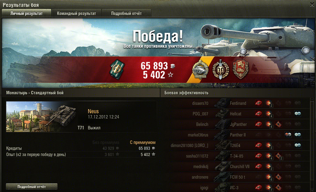 Ха, танк супер - второй воин на нем, второй Рэдли-Уолтерс. Уже второй раз пишу сюда :) Победа!Бой: Монастырь 17 декабря 2012 г. 12:24:22Танк: T71Получено опыта: 5 402 (x2 за первую победу в день)Получено кредитов: 65 893Достижения в бою: Медаль Рэдли-Уолтерса, «Воин», «Защитник», «Бронебойщик»В общем, повезло, враги тупанули, но так оно и бывает :) враги тупят а ты тащищь.Если у кого есть большое желание посмотреть реплей, скажите, выложу :) Да :) мастера наверно сейчас людям сложно на этой технике брать, ибо опыты на ней большие
