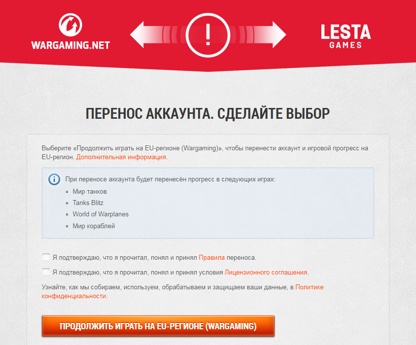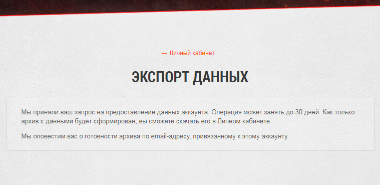 Пишу с твинка, т.к. даже не могу написать с основы в ЦПП - ни ВГ ни Лесте, т.к. требуется выбрать регион. Для ясности: хочу остаться в РУ регионе (выбрать Лесту). Проблема: 3 октября запросил экспорт данных в ЛК ВГ (дабы посмотреть всю историю покупок). Наступило 12 октября, перенос аккаунта стал обязательным, а отчёт так и не был сформирован. Теперь неизвестно что с этой заявкой и отчётом. Если я выберу Лесту сейчас, пока формируется отчёт (опять же, если он формируется ещё), то, будет ли отчёт? Я ведь запросил его ДО переноса аккаунта. В ЛК ВГ возобновилась страница (https://ru.wargaming.net/personal/takeout) с сообщением о том, что отчёт формируется (см скрин). 12-13 числа, эта страница не была доступна, вместо неё перенаправляла на трасфер акка. Как по другому можно связаться с ВГ? Писал сюда: Wargaming Player Support почта wgcis_wot@support.wargaming.net (13 окт) но ответа так и не поступило. P.S: Вариант: выбрать сначала ЕУ регион, получить отчёт (хотя не факт, что его предоставит и ВГ, из-за разделения), потом вернутся на РУ - на самый крайний случай, ибо - возможность сменить регион в будущем (мало ли), терять хочу.