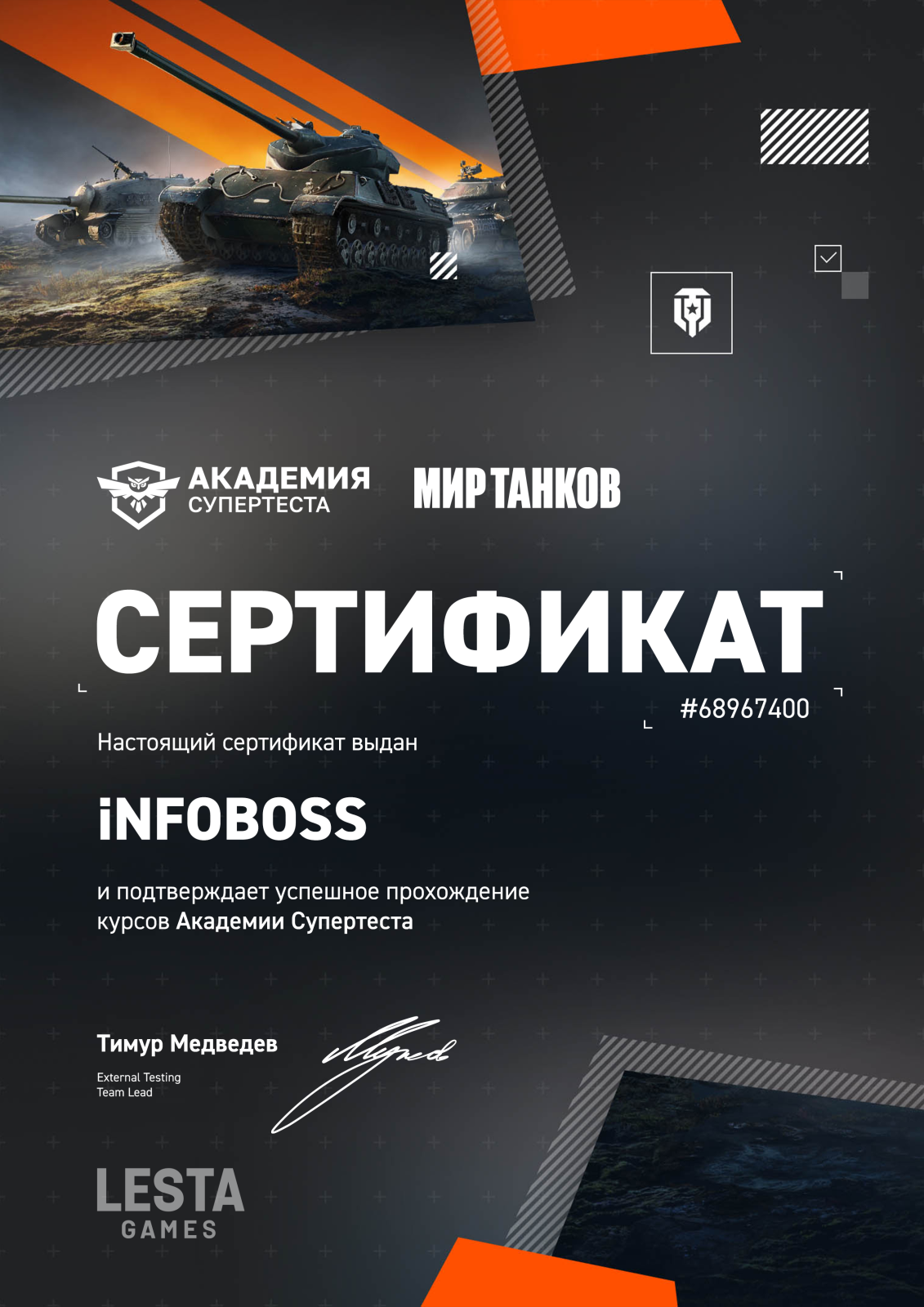 68967400 = Номер выданного вам сертификата Академии Супертеста (сверяется по базе номеров); Отсутствует опыт в других играх = Опыт тестирования других игр; Очень хочу сделать удобнее использование укрепрайонов, так как достаточно часто играю в командные бои. Хочу улучшать интерфейс игры и эффективно убирать баги и ошибки в предверсиях игры. Есть ценные идеи по улучшению ЦПП и сбора обратной связи от игроков. Есть важные мысли по монетизации для вашей компании из Укрепрайонов. Например можно сделать возможность вести набор игроков со ставкой в виде голды с фильтрацией по проценту побед и нужным танкам в ангаре у игрока. И за проведенные бои в укрепрайоне полевой командир например назначает количество ЗОЛОТА из казны клана или из своего личного доп счёта для укрепрайонов, чтобы подходящие сильные игроки в первую очередь заходили в такие команды в укрепрайонах)) Вам выгодно, что полевые будут покупать голду для этих целей или использовать накопленную голду из казны клана)) Это как одна из идей монетизации с пользой для вашей компании и удобством для игроков в укрепах. Удобно с 20мск примерно и до 23мск. Но не каждый день конечно)) В воскресенье тоже удобно будет в это время. В субботу не очень удобно, так как постоянно идут военные игры за голду и командная игра : )) На данный момент не являюсь волонтёром больше ни в каких играх, кроме как у вас хочу стать в игре Мир Танков Отказ. Причина в ЛС.