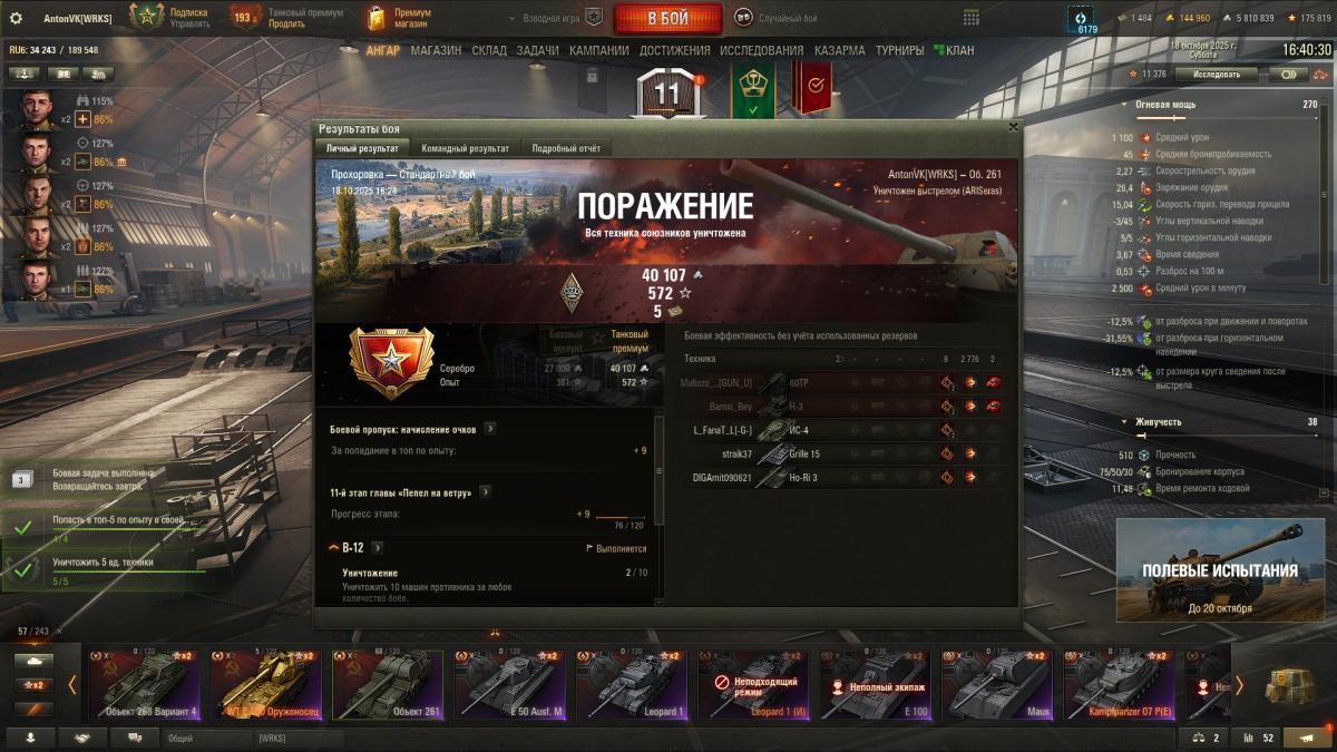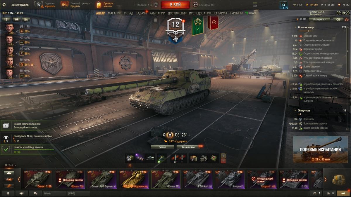 55 боёв вчера, 25 сегодня уже. В основном на ТТ. Арта закидывает, да, больно и сильно. Но особо не страдал как-то. Не могу пожаловаться, что арта меня доставала. Сам тоже играл на ней вчера. Видел то видео, у корбена, где он про танки говорит и сообщает, что клан распустил и аккаунт удаляет, и фрагмент боя он там на об 261 в самом конце уже гриль прямой наводкой убил ) Клан вот зря распустил, надо было передать ответственному последователю.