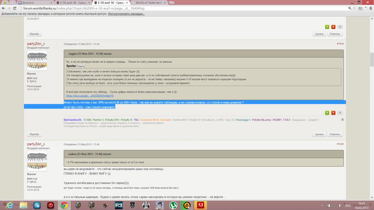 Знаете, я как образованный человек опираюсь на "циферки" и СВОЙ опыт (а не как вы на стр. 83 данной темы написали: "Может быть потому у вас 39% на еноте М за 300+ боев , так как вы верите таблицам, а не словам юзеров, со статой и норм домагом ? (я не про себя - сам слушал шарящих)"). Как раз вся игра строится на определенных принципах, "циферках" и алгоритмах со всеми их графиками, таблицами, ...
