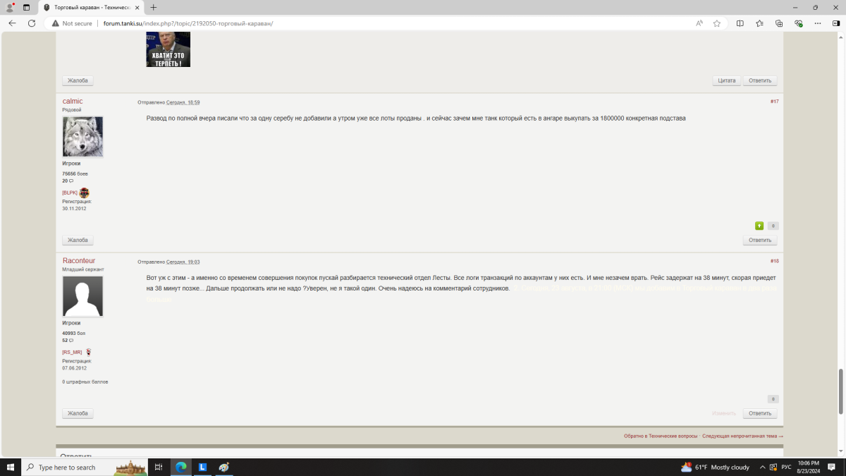 3. Вот уж с этим - а именно со временем совершения покупок пускай разбирается технический отдел Лесты. Все логи транзакций по аккаунтам у них есть. И мне незачем врать. Рейс задержат на 38 минут, скорая приедет на 38 минут позже... Дальше продолжать или не надо ?Уверен, не я такой один. Очень надеюсь на комментарий сотрудников. 2. Сегодня, 23 августа, в 21:00 (МСК) мы добавим в Торговый караван в два раза больше