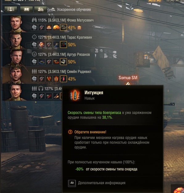 2. Добрейшего вечерочка, вкачалась интуиция на ис 7 а кд при заюзе перка 6 секунд между сменой снаряда,в описании перка написано 38%,ниже написано при 100% перке - 60 % от кд, вопрос: а почему я этого парня обучал,а он все равно долго подносит снаряд?