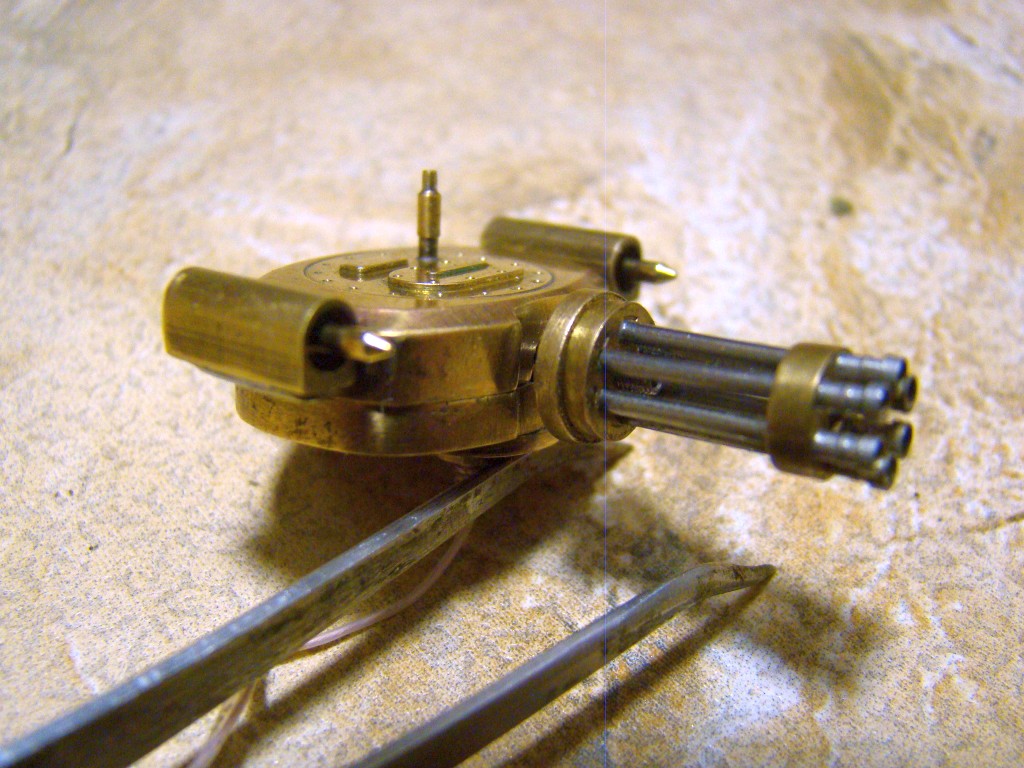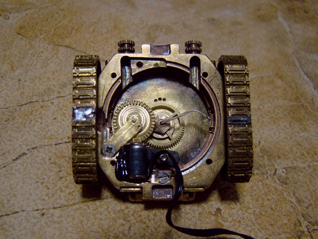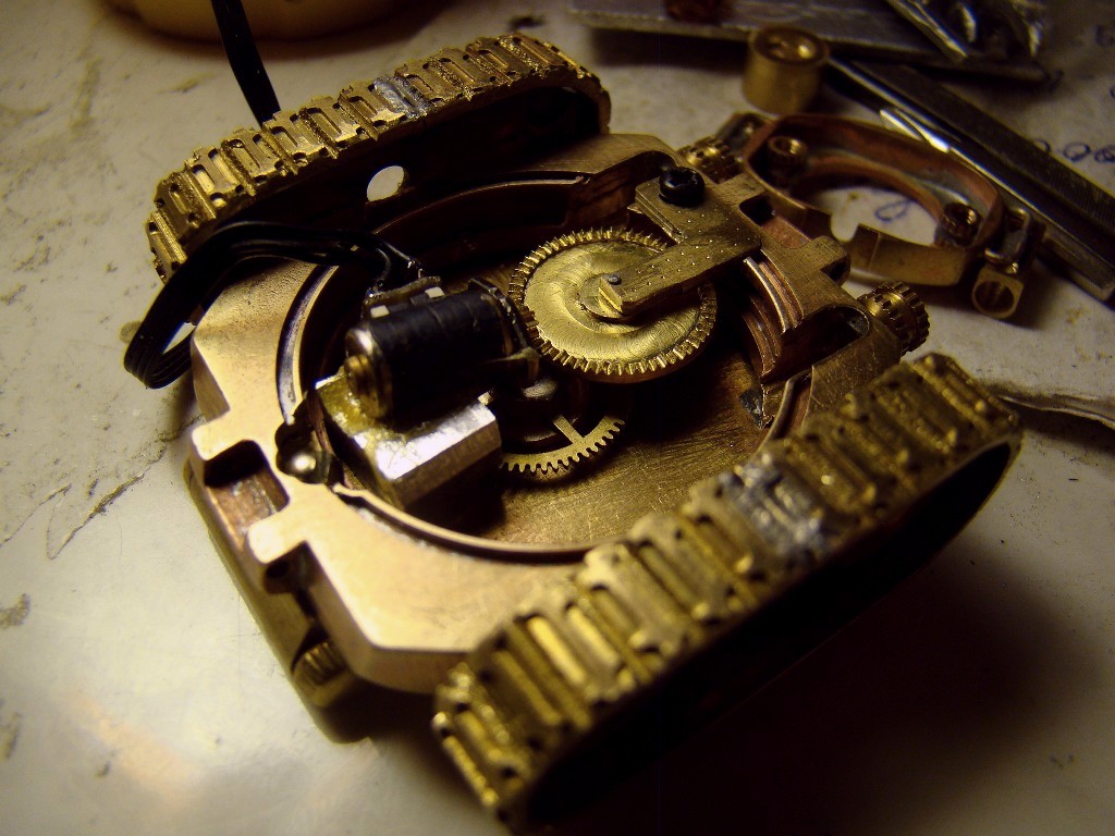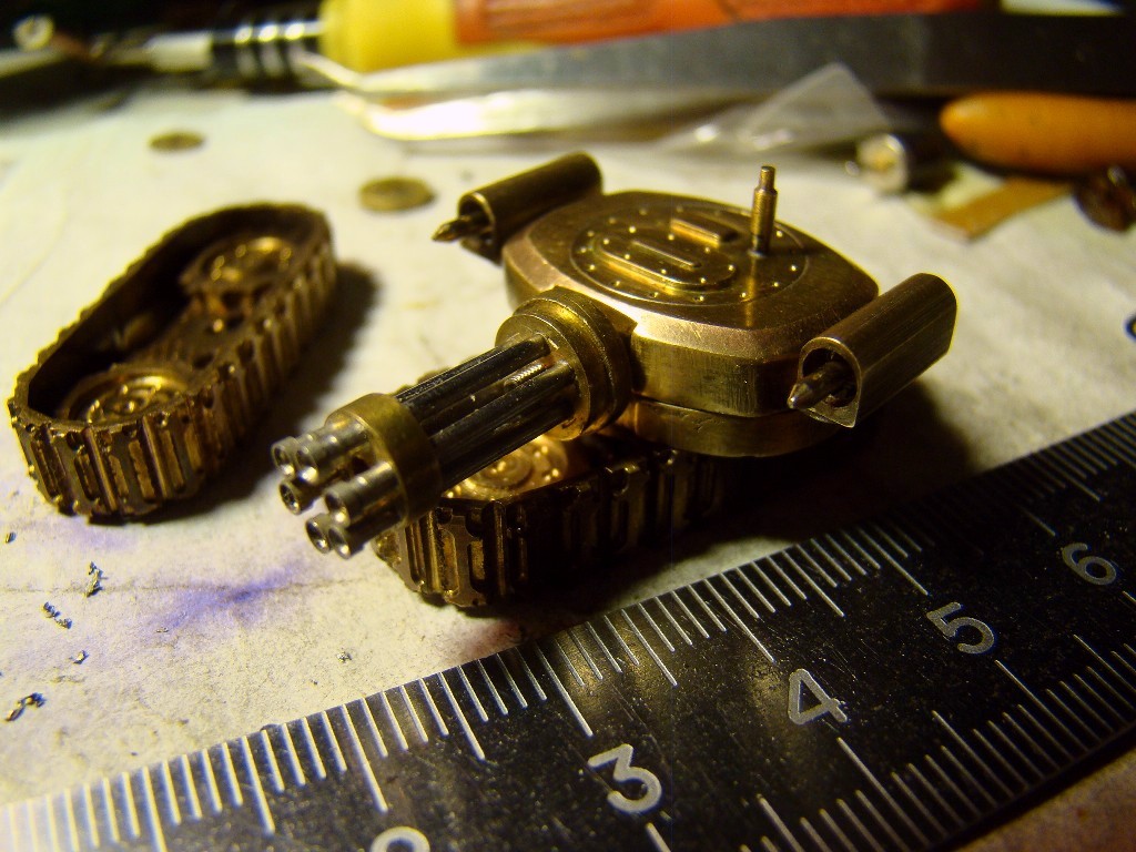 Всем привет. Это не совсем модель, скорее - просто миниатюра из металла. Предварительные размеры - 50х45х25мм, реально получившиеся - 47х46х23 мм Используются корпуса от старых наручных часов и мелкие латунные ништяки. Крепление деталей - пайкой и винтами. http://cdn-frm-eu.wargaming.net/wot/ru/uploads/monthly_07_2016/post-70420413-0-39873200-1469663573_thumb.jpg http://cdn-frm-eu.wargaming.net/wot/ru/uploads/monthly_07_2016/post-70420413-0-52733900-1469663576_thumb.jpg http://cdn-frm-eu.wargaming.net/wot/ru/uploads/monthly_07_2016/post-70420413-0-83819600-1469663574_thumb.jpg Гусли точились из латунного листа в два захода : сначала рельеф, потом прорези между траками. Во время второго этапа поломался кончик фрезы, поэтому автоматом получилась имитация грязи http://cdn-frm-eu.wargaming.net/wot/ru/uploads/monthly_07_2016/post-70420413-0-50692000-1469664322_thumb.jpg http://cdn-frm-eu.wargaming.net/wot/ru/uploads/monthly_07_2016/post-70420413-0-49215100-1469664409_thumb.jpg http://cdn-frm-eu.wargaming.net/wot/ru/uploads/monthly_07_2016/post-70420413-0-00945300-1469664324_thumb.jpg Башня будет поворотная, а для того, чтобы в нее можно было подать питание, пришлось городить такую конструкцию : http://cdn-frm-eu.wargaming.net/wot/ru/uploads/monthly_07_2016/post-70420413-0-32393200-1469664777_thumb.jpg http://cdn-frm-eu.wargaming.net/wot/ru/uploads/monthly_07_2016/post-70420413-0-10920500-1469664776_thumb.jpg http://cdn-frm-eu.wargaming.net/wot/ru/uploads/monthly_07_2016/post-70420413-0-75056500-1469664774_thumb.jpg И предварительный результат : http://cdn-frm-eu.wargaming.net/wot/ru/uploads/monthly_07_2016/post-70420413-0-76895200-1469665251_thumb.jpg http://cdn-frm-eu.wargaming.net/wot/ru/uploads/monthly_07_2016/post-70420413-0-25306500-1469665253_thumb.jpg
