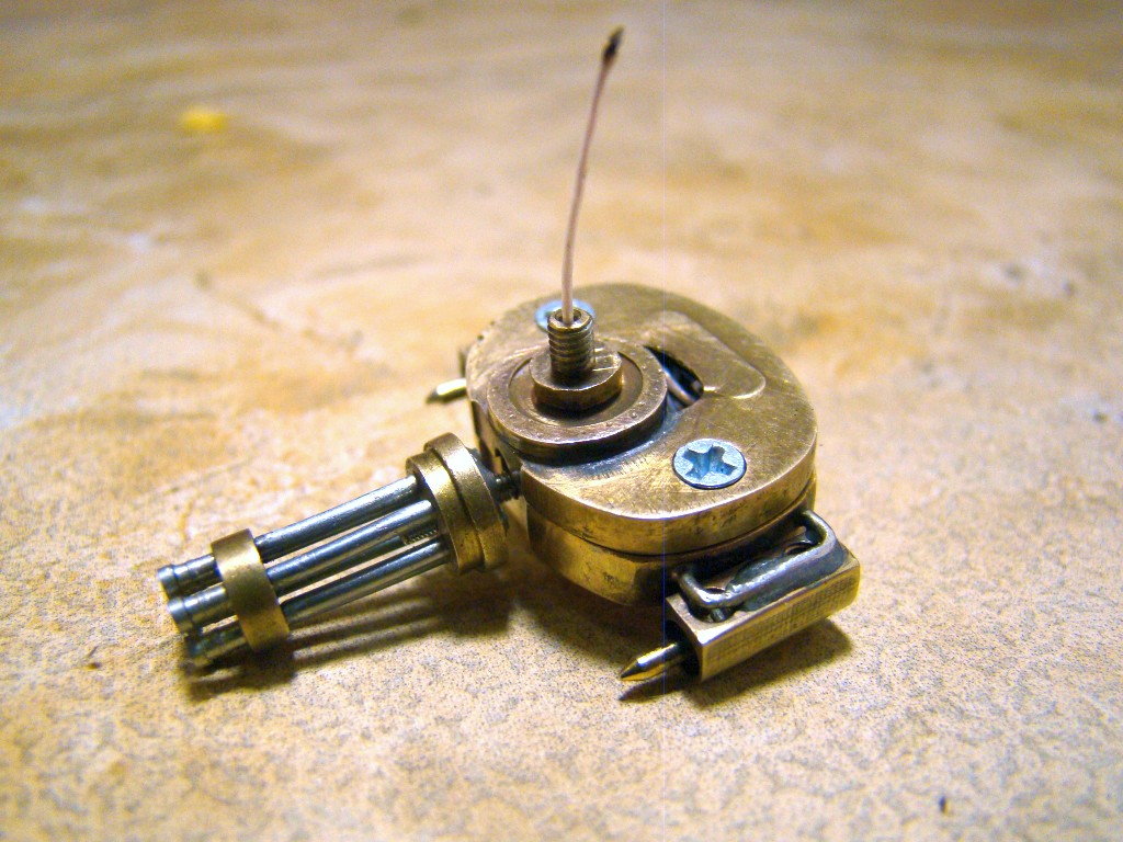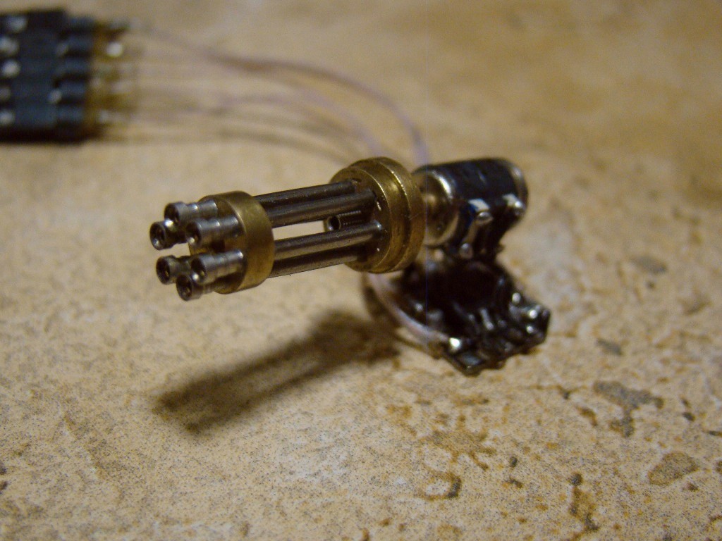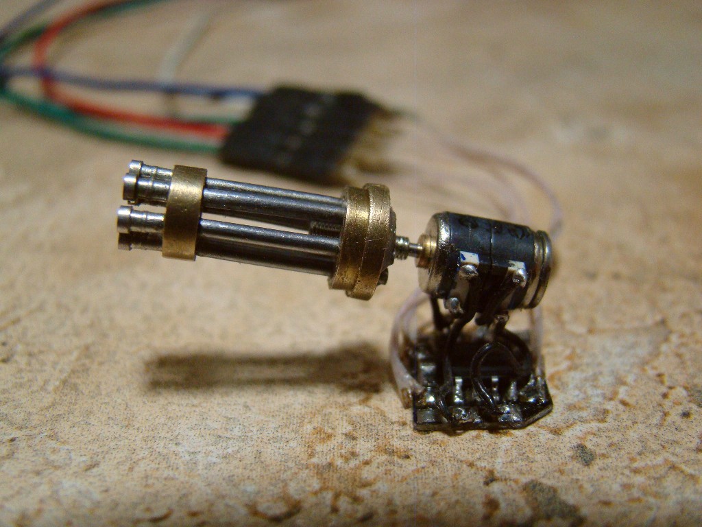 Вибры слишком скоростные для этих целей, для них пришлось бы собирать редукторы с большим передаточным числом. Понизить входные 10-15 тыс оборотов до приемлемой скорости башни - задача не для текущих размеров корпуса. Для привода гатлинга и башни используются шаговые моторчики, типа тех, что стоят в зум-объективах цифровых мыльниц. Для башни пришлось точить косозубую шестерню, получилось только со второго раза. Точнее, и вторая шестеренка тоже не идеал, но пока что оставлю ее http://cdn-frm-eu.wargaming.net/wot/ru/uploads/monthly_07_2016/post-70420413-0-67920400-1469689042_thumb.jpg http://cdn-frm-eu.wargaming.net/wot/ru/uploads/monthly_07_2016/post-70420413-0-23192600-1469689044_thumb.jpg Тестовый запуск : Из второго корпуса, еще более старого и облезлого, сделал днище http://cdn-frm-eu.wargaming.net/wot/ru/uploads/monthly_07_2016/post-70420413-0-79474200-1469689424_thumb.jpg http://cdn-frm-eu.wargaming.net/wot/ru/uploads/monthly_07_2016/post-70420413-0-23816200-1469689426_thumb.jpg http://cdn-frm-eu.wargaming.net/wot/ru/uploads/monthly_07_2016/post-70420413-0-74009100-1469689427_thumb.jpg http://cdn-frm-eu.wargaming.net/wot/ru/uploads/monthly_07_2016/post-70420413-0-33131700-1469689429_thumb.jpg Дальше добавил немного мелочевки. Паять приходится на разогретый корпус и тут важно, чтобы не отвалились предыдущие детали. Ну и не нагадить припоем, поскольку из швов его потом очень тяжело вычищать. http://cdn-frm-eu.wargaming.net/wot/ru/uploads/monthly_07_2016/post-70420413-0-69302800-1469689701_thumb.jpg http://cdn-frm-eu.wargaming.net/wot/ru/uploads/monthly_07_2016/post-70420413-0-30780800-1469689703_thumb.jpg Гатлинг. Собирал его еще в прошлом году, но тогда применения ему найти не смог. Сейчас же он отлично вписывается в общий вид. http://cdn-frm-eu.wargaming.net/wot/ru/uploads/monthly_07_2016/post-70420413-0-66284500-1469690259_thumb.jpg http://cdn-frm-eu.wargaming.net/wot/ru/uploads/monthly_07_2016/post-70420413-0-54608700-1469690261_thumb.jpg http://cdn-frm-eu.wargaming.net/wot/ru/uploads/monthly_07_2016/post-70420413-0-08272500-1469690264_thumb.jpg http://cdn-frm-eu.wargaming.net/wot/ru/uploads/monthly_07_2016/post-70420413-0-84729900-1469690265_thumb.jpg