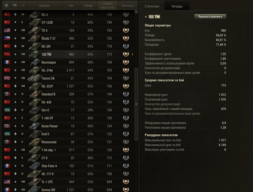 https://forum-mt-prod.lesta.ru/monthly_02_2025/post-705838-0-13933800-1739092517_thumb.png - Сильный плюс 122ТМ это - быстрый и точный снаряд. Отлично подходит для уничтожения светляков и другой подвижной техники. Также имеет неплохое пробитие и позволяет попадать с пробитием в уязвимые точки более бронированных машин. Из иных плюсов? Это хорошая стабилизация, углы склонения орудия, альфа 400. Также у 122ТМ есть бронирование, которое эффективно с увеличением дистанции. - Сильный минус ДПМ. Слабые минусы это относительно большие люки (в игре есть гораздо больше) и слабая подвижность (относительно своего класса СТ). Поэтому все построение успешной игры на 122ТМ происходит понимания как реализовать альфу и не попасть под раздачу вражеских ДПМов. /- простыми словами.... руки... из.... -уть и включить голову. Спешить на этом танке не рекомендую. На мой взгляд лучший набор модулей: - система повышения мобильности Т2 (в комплекте с вентилятором и рационом позволяет отказаться от стабилизатора, также повышает мобильность, что положитено сказывается на выживаемости и "настреле" - вентилятор (немного повышает все до уровня "сойдет", повышает скорострельность ) - боновый досылатель (обязательный модуль, заметно повышает скорострельность) Я не самый сильный и умный игрок и для меня эти показатели уже "выше нормы". - улучшенный рацион (немного повышает все до уровня "сойдет", повышает скорострельность ) /- итоговый дпм у меня 1811 урона/мин /- мой средний по статистике 1672 урона на 968 боев /- мой максимальный 6149 урона