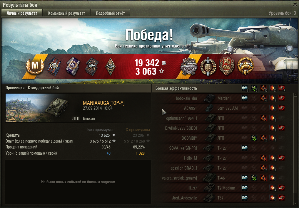 только что был прикольный бой. против взвода начинающих нагибаторов песка на т127. Вконце остался один против четрверых игроков, но таки смог вытащить. Причем экипаж 80%. http://wotreplays.ru/site/3683441#provinciya-mania4uga-ltp