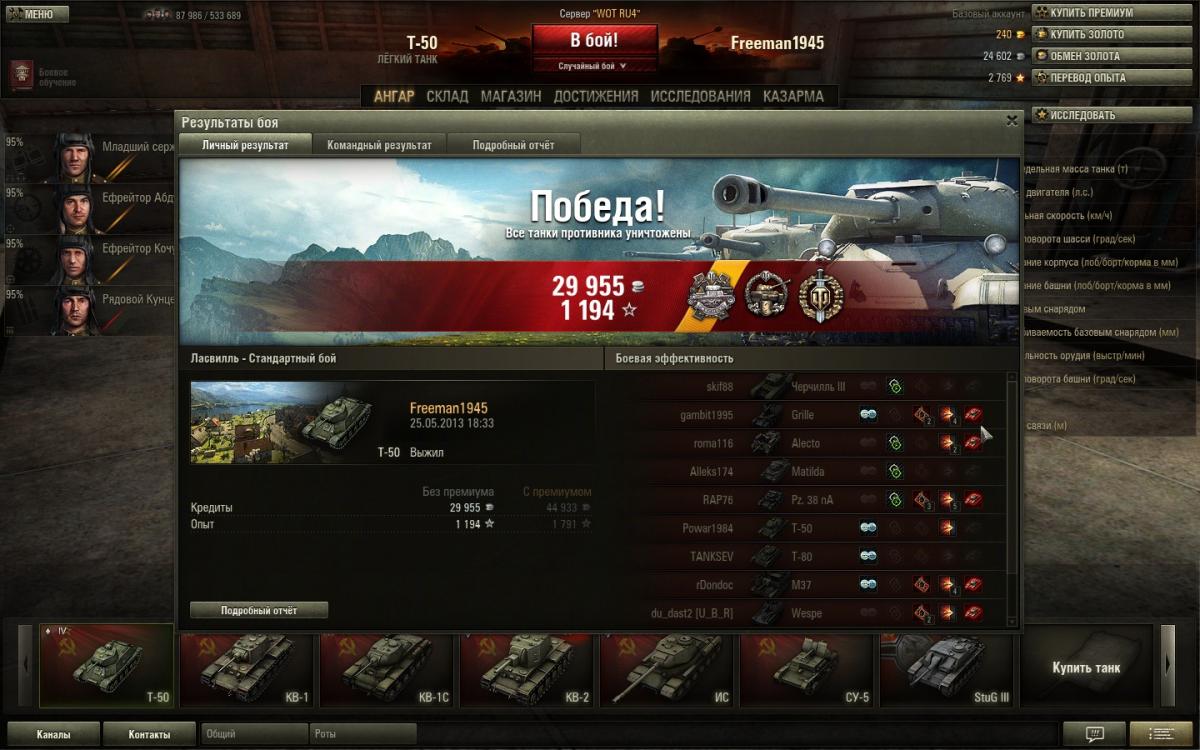 Маленькая победа на проданном после выхода последнего патча Т 50: Причина продажи: снижение его скорости. А так в том памятном бою уничтожил 7 танков противника. Жаль не сделал скрин раздела командный результат.