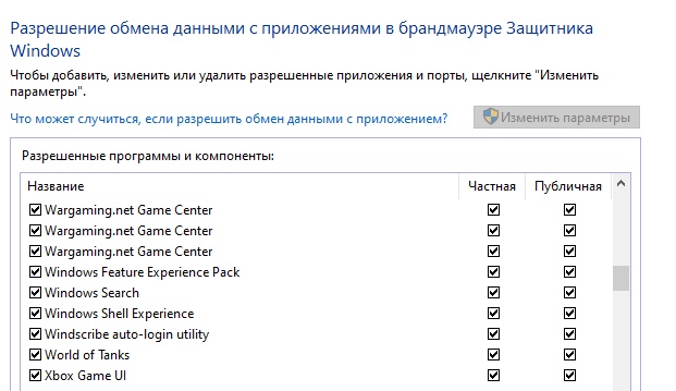 http://cdn-frm-eu.wargaming.net/4.5/style_images/wg/snapback.pngirlandsky_dr (10 май 2021 - 10:26) писал: 1. Войдите в Windows с учетной записью, которая имеет права администратора. 2. Откройте Панель управления (Все элементы) . 3. Щелкните значок Брандмауэр Windows. 4. В левой части окна щелкните ссылку Разрешить запуск программы или компонента через брандмауэр Windows. 5. Нажмите кнопку Изменить параметры. Если кнопка Изменить параметры неактивна (затенена серым) , то переходите к следующим инструкциям. 6.1 Изменение и удаление существующих разрешений Чтобы разрешить программе доступ к частной сети, установите флажок Домашняя или рабочая (частная) . Чтобы запретить доступ, снимите этот флажок напротив названия программы. Чтобы разрешить программе доступ к интернету, установите флажок Публичные. Чтобы запретить доступ, снимите этот флажок напротив названия программы. Чтобы удалить существующее правило, выделите строчку с названием программы и нажмите кнопку Удалить. Подтвердите свое решение, нажав кнопку Да. 6.2 Создание новых правил для программ Нажмите кнопку Разрешить другую программу. В открывшемся окне выделите программу, для которой нужно создать правило сетевого доступа и нажмите кнопку Добавить . 7. Нажмите OK. вроди там у меня все правилно так и стоит