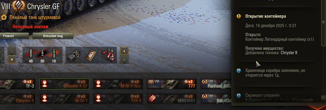 Спасибо Леста за второй дубль из легендарки. Сначала Крайслер, теперь СТГ, ещё оставался Бульдог из 13 танков которых у меня нет из списка, ну тут пошло что то не так и первый выпал защитник (хотя должен был выпасть точно Бульдог который уже есть, видимо Янот сломался), не совсем халява лямов 40 отдал, тяжело посчитать не записывал. Да и про 3 гаранта из коробок я вам напомню, больше не брал.