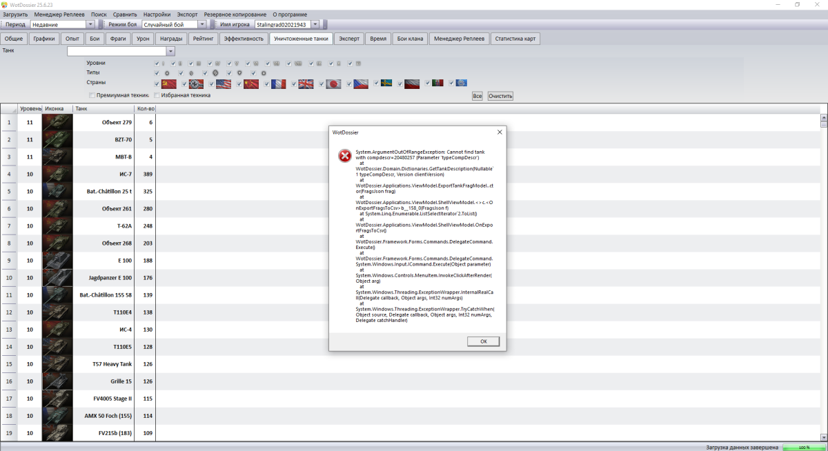 Огромное спасибо за обновление программы!!! Раздел "Уничтоженные танки" теперь отображается. Однако при экспорте этого раздела в csv происходит ошибка. https://forum-mt-prod.lesta.ru/monthly_06_2025/post-7155710-0-07689000-1750809237_thumb.png Можете поправить. Заранее спасибо.