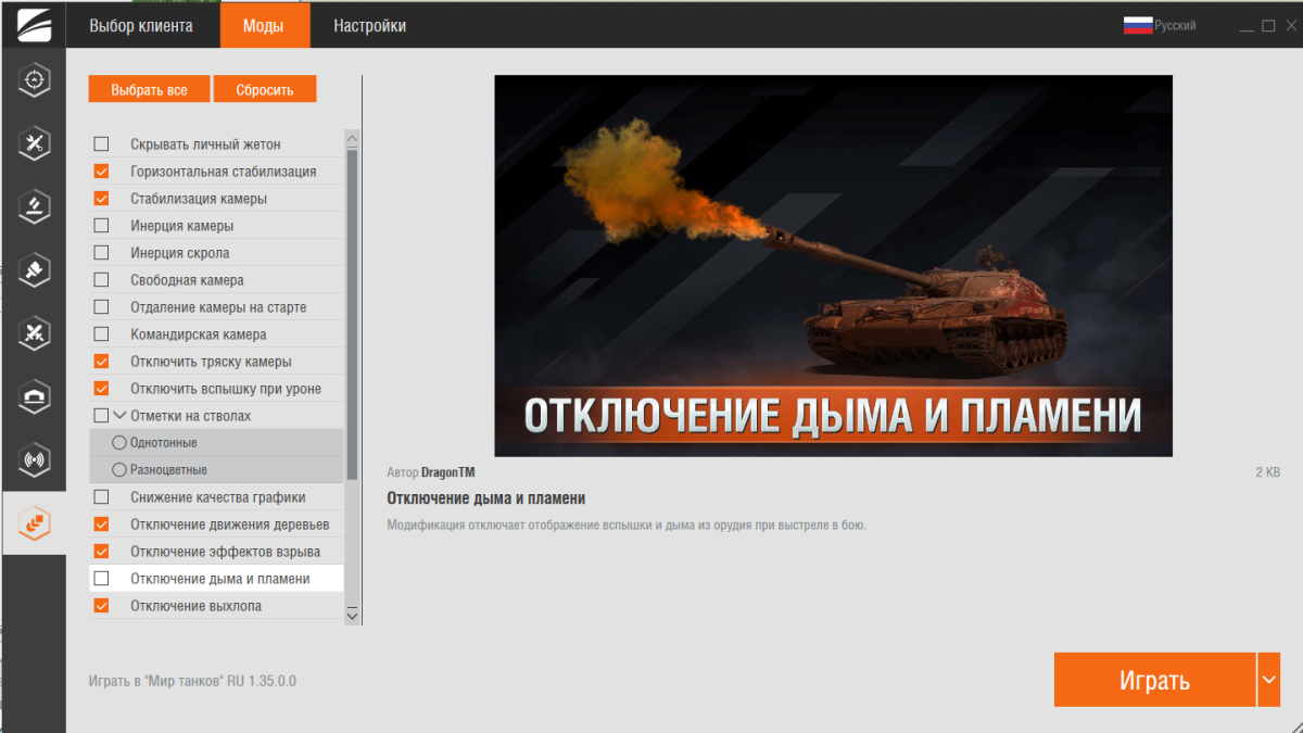 Мод отключение дыма и пламени отключает и звук выстрела. Непривычно и неудобно.