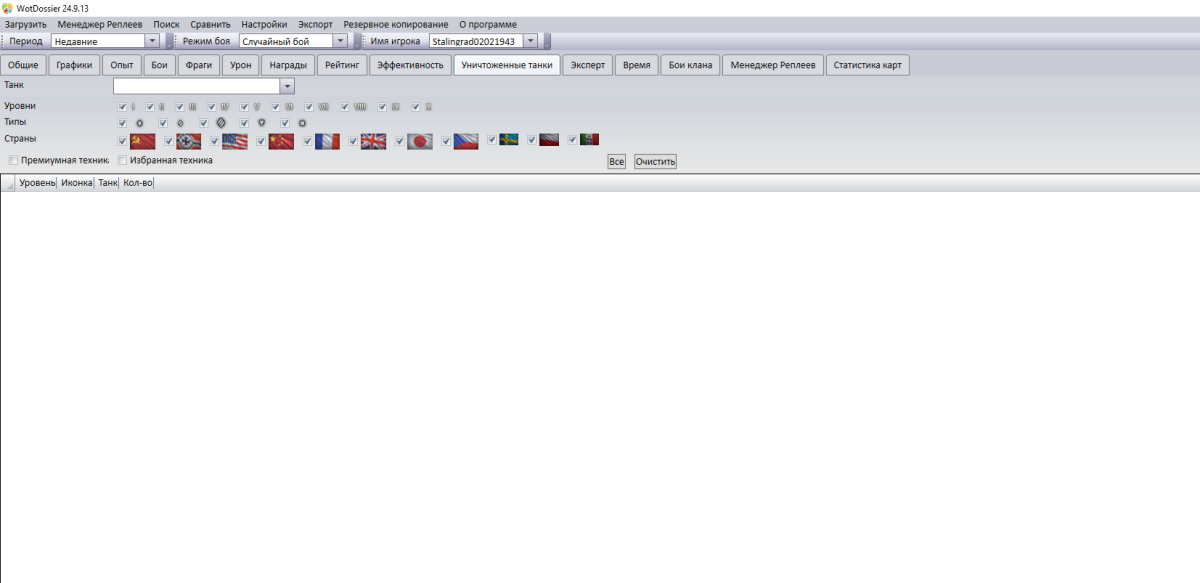 Программа-то обновилась, но все таки не до конца. https://forum-mt-prod.lesta.ru/monthly_11_2024/post-7155710-0-56046800-1731163153_thumb.png Вкладка Уничтоженные танки так и пустая. Соответственно и выгрузка в csv выдает ошибку.
