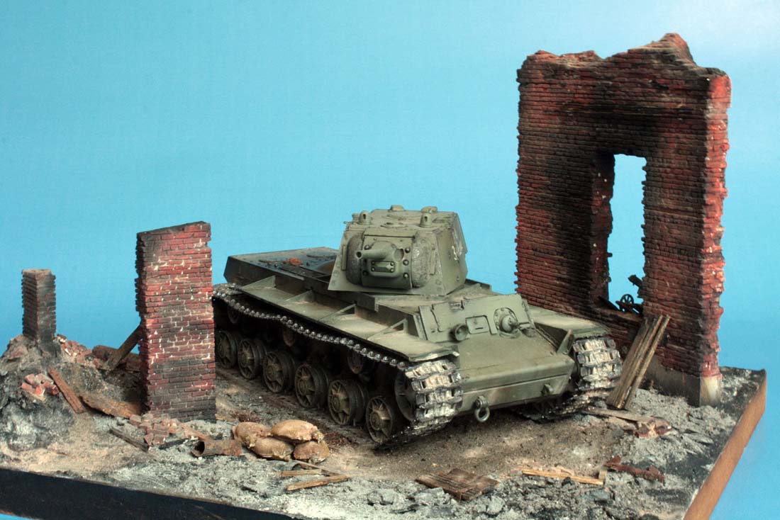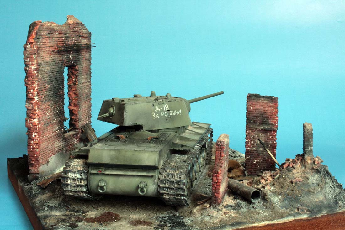 Всем доброго дня! Представляю небольшую диорамку КВ-1 , Сталинград осень 1942г. Танк строился по прототипу КВ-1 из 133 танковой бригады Сталинград сентябрь 1942г. Изучив множество фотоматериалов данного прототипа и литературы, приступил к постройке. Данный набор что дает Trumpeter не очень то подходит к выбранному КВ. Исходя из имеющихся и подручных материалов произвел некоторые изменения и переделки. Старался как можно ближе приблизить к прототипу. Что сделано: -Сварные швы по корпусу. - Переделаны задние и передние буксирные приспособления (буксирные рымы). -Переделана передняя часть корпуса, лист доп. брони, проводка к фаре, люк мехвода, пулеметы из мед. иглы. -Переделаны и застеклены все перископы. -фактура литой брони маски пушки. -Стыки бронеплит и усилительный уголок. -Бортовые надписи делались от руки. - Траки c чередующимся гребнем. Покраска красками Tamiya , химия MIG Подставка , развалены самодел. Приятного просмотра!
