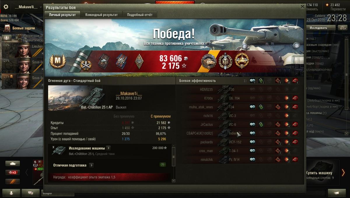 Что Bat Chat 25t A, что АМХ 30 танки капризные, ошибок не прощают. Бат через бой в топе, ВБР его любит, этим самым ВБР как бы компенсирует его слабые стороны, коих больше чем сильных. Без према будешь в ноль уходить, само собой хотя бы со средним настрелом и выживаемостью. С премом очень даже не плохо фармит. Только что исследовал Бата старшего. Потребовалось ровно 230 боев, на исследование. И как совпадение последним боем заслужил 3ю отметку. Плюс еще последним выстрелом забрал последнего врага) Не плохое и символичное завершение. http://cdn-frm-eu.wargaming.net/wot/ru/uploads/monthly_10_2016/post-72402779-0-69538500-1477762836_thumb.jpg Краем уха слышал, что с 1го ноября начнутся скидки на ветку бат чата. Есть у кого подтверждения этому?