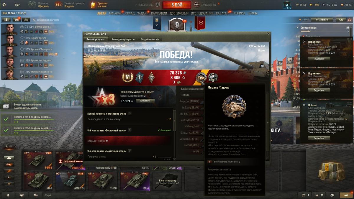 Прошел все главы БП. Это уже был третий или четвертый пройденный мною БП в этом году. Очень доволен тем, что жетонов хватило ровно на 4 танка и оборудку и не осталось лишних жетонов. Так-как я не любою донатить в онлайн играх, мне сильно помогла акция с золотым вагоном, благодаря которой, я получил более 20000 золота на покупку улучшенных БП. Получается, что эти 4 прем танка и две сотни дней премиума из боевых пропусков, удалось получить без доната.