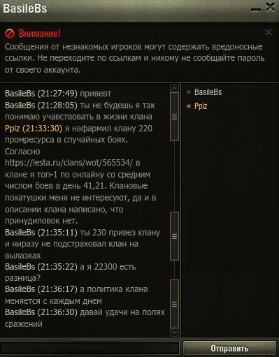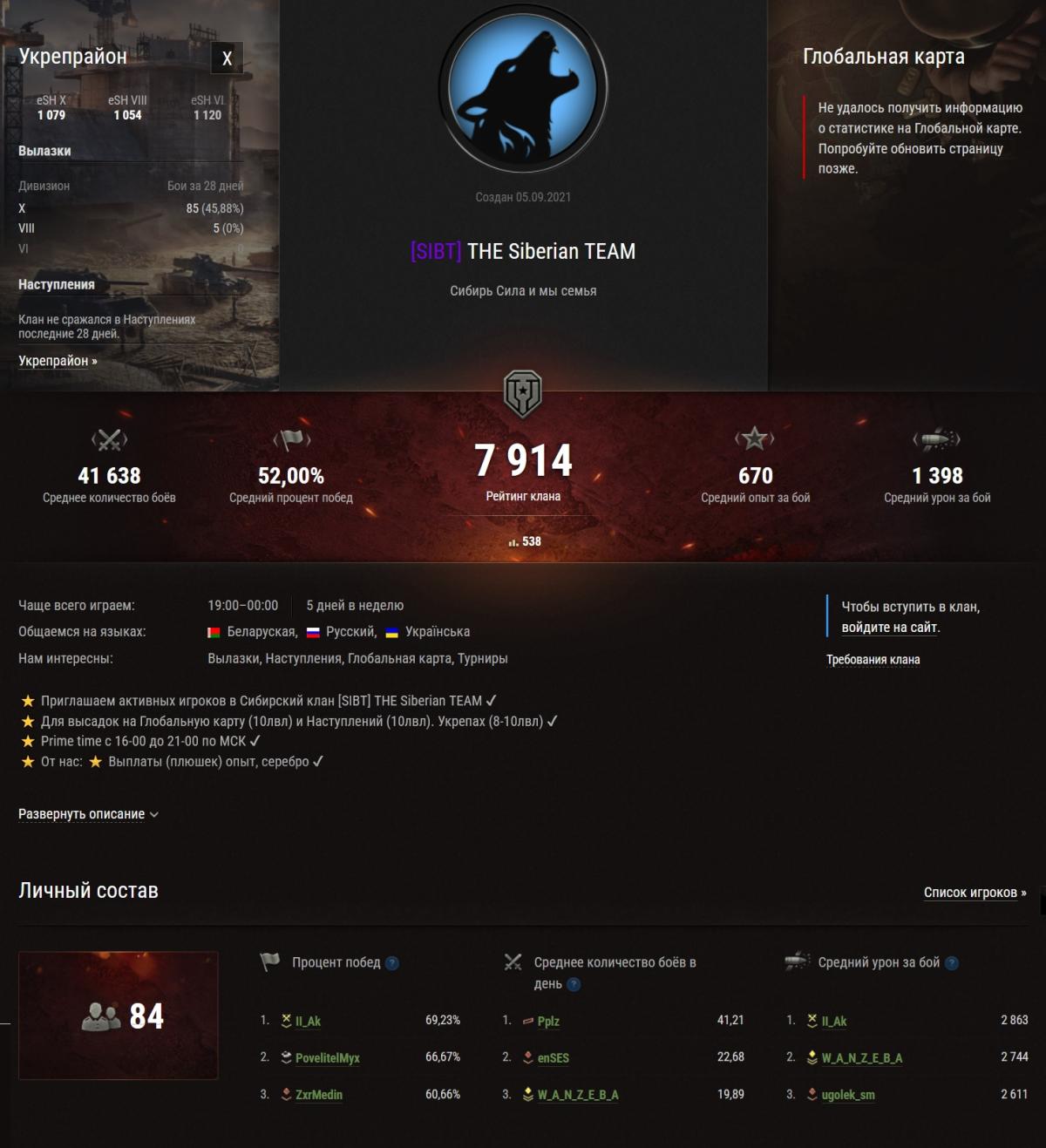 30 лет https://tanki.su/ru/community/accounts/735248-Pplz/ Ищу клан с Сибирским\ДВ РТ, включающий резервы в 14:00-18:00 МСК Имею проблемку - у меня глухота и я не могу играть в клановых режимах (вылазки, укрепы, наступления и т.д) требующие голосовую связь (и по этой же причине, не хочу устанавливать Дискорд\Тимспик т.к. не общаюсь голосовой связью. Был в [sIBT] пока меня не кикнули за отказ устаналивать тимспик ), хотя по активности я был на 1-ом месте. Сейчас я нахожусь в поиске нового клана, в котором нет требования обязательного участия в этих режимах игры или установки какой-либо программы для общения.