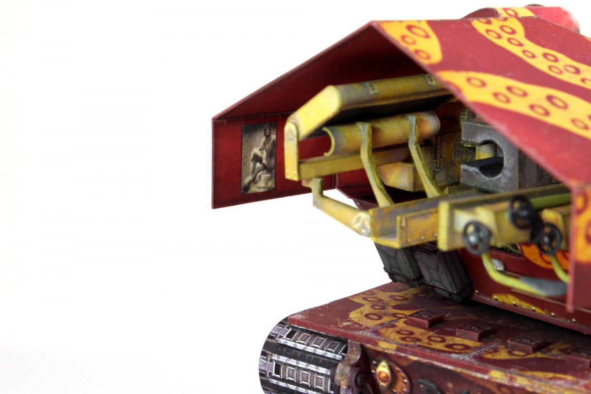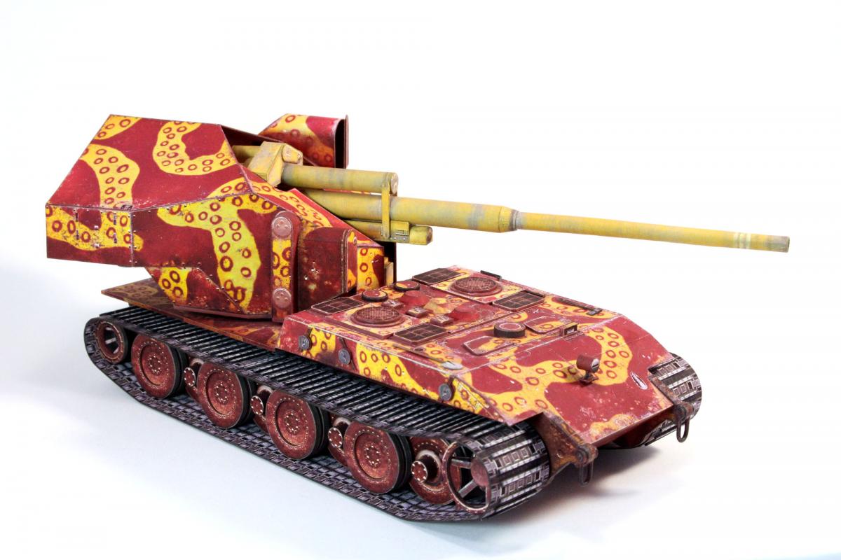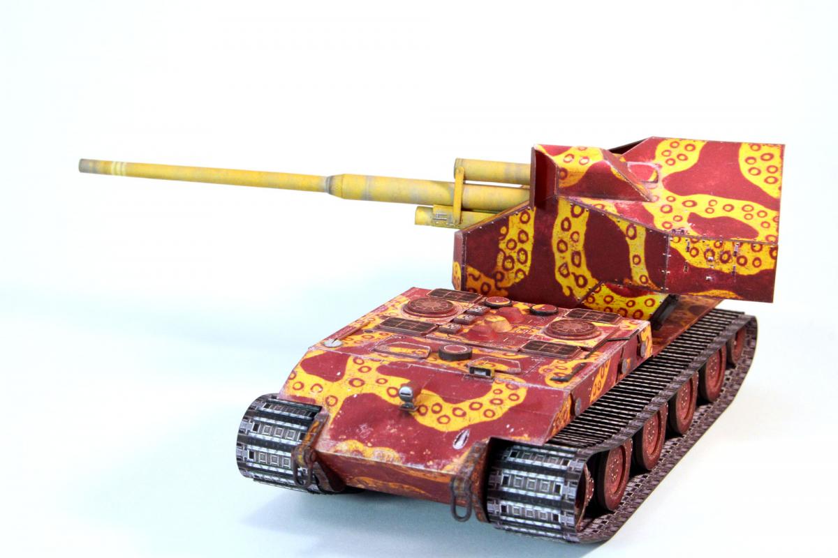 Ходовая в сложном варианте. Цвета принтер выдал весьма сочные - вместо красно-коричневого получился красный. В общем, машина "Инженера" Серый был только в варианте БК - но там модель сильно скучная по деталировке. Изначально сделал возможность и вертикальной наводки - но уже готовое орудие со щитом уронил/сломал/приклеил намертво. Так бывает.