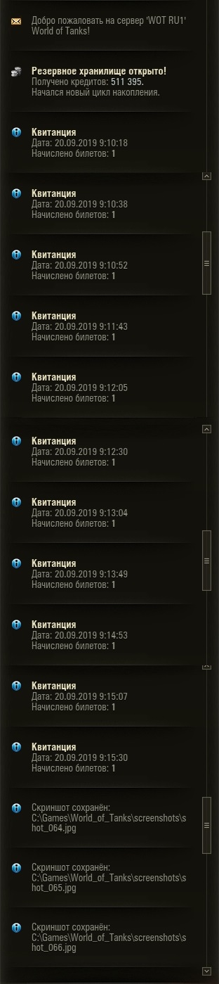 http://cdn-frm-eu.wargaming.net/4.5/style_images/wg/snapback.pngNimvul (20 сен 2019 - 11:05) писал: я может плохо смотрю , но я не вижу скрина с общим количеством билетов , до (желательно) и после А я, по твоему, должен был предполагать, что начислят меньше билетов и сделать скрин заранее? В общее количество билетов добавилось 11 штук по сравнению со вчерашним. Скрин (до) естественно не делал, откуда я мог знать? Ну выложу я скрин (после), и что это даст? Сколько было (до) кроме меня ведь никто не знает. Там по квитанциям видно, что 11 начислили.