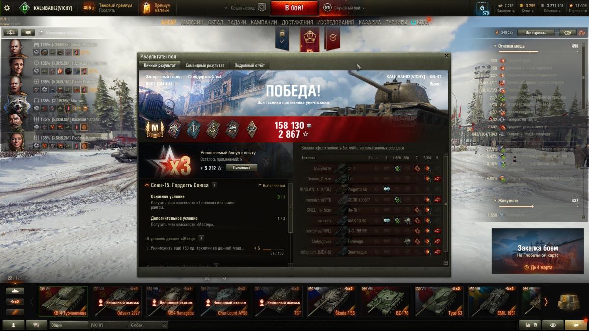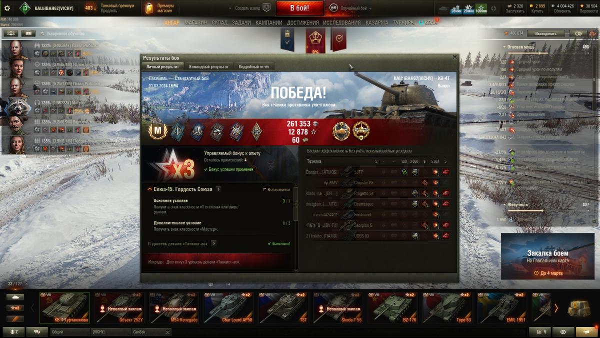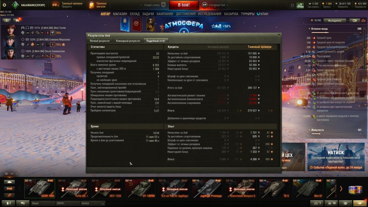 Победа! Бой: Минск Техника: КВ-4 Турчанинова Получено опыта: 3 029 Получено кредитов: 315 024 Достижения в бою: «Основной калибр», «Боец», «Непробиваемый», «Огонь на поражение», «Костолом», «Поджигатель», Знак классности «Мастер» http://tankireplays.lesta.ru/site/14504589#minsk-kalbibah62-kv-4_turchaninova