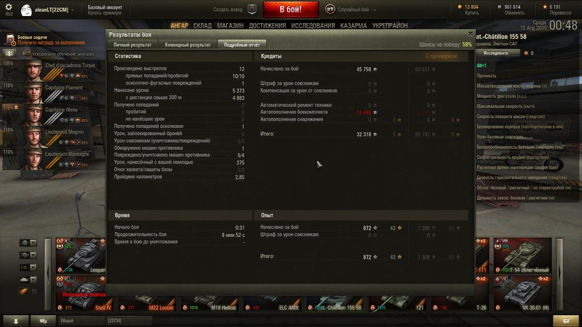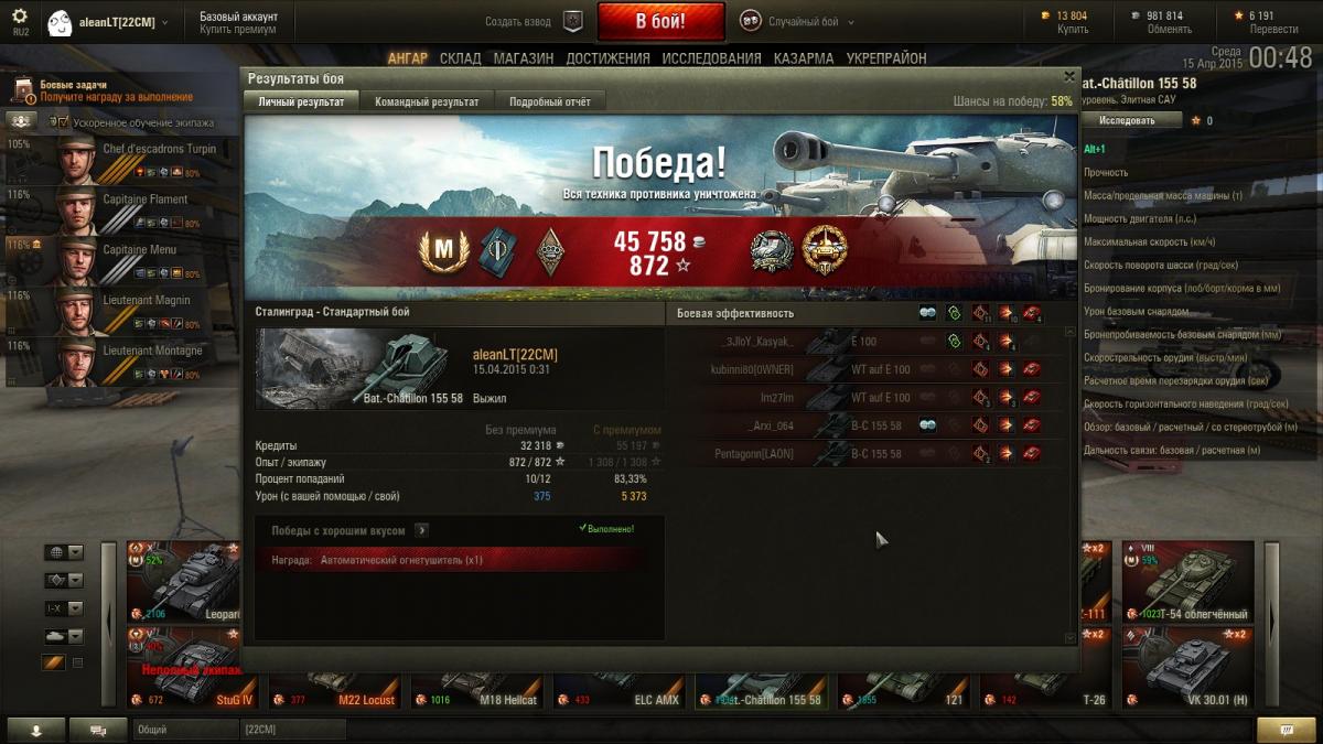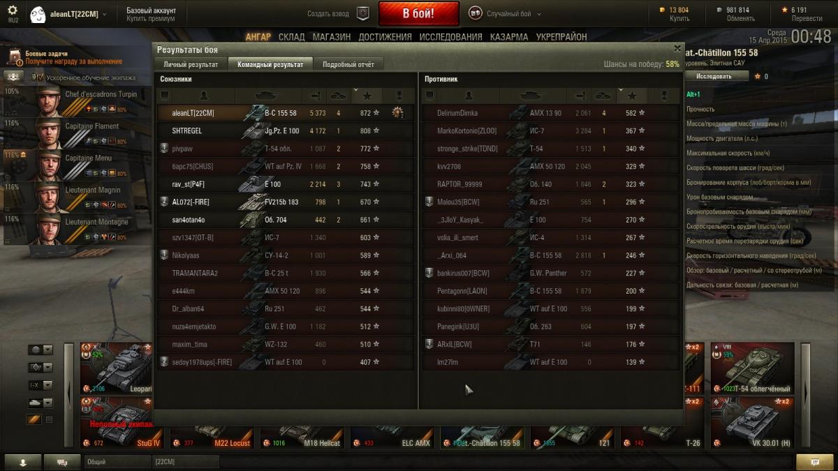 Решил описать бой, прошу понять и простить http://cdn-frm-eu.wargaming.net/4.3/style_emoticons/wot/Smile_crab.gif Многабукаф под спойлером. Известный факт, что, согласно текущей механике игры САУ, стреляющая почти всегда не по своему засвету, получает гораздо меньше опыта, чем прочая одноуровневая техника. По-этому, играя на САУ, тяжело оказаться вверху списка команды по набранному опыту. Играя на топовой САУ 10-го уровня, ещё тяжелее, так как отсутствует повышение опыта за нанесение урона танкам выше уровнем. Очень, очень тяжело. Но при должном умении, сноровке и малой толике везения это возможно. КАК ЭТО БЫЛО Когда-то решил, что батчат 155 58, всё же, немного любимее мне, чем объект 261. Сам я считаю себя игроком среднего уровня P.S. Это был мой 1001-й бой на батчате 155 58 http://cdn-frm-eu.wargaming.net/wot/ru/uploads/monthly_04_2015/post-7434940-0-23678700-1429125047_thumb.jpghttp://cdn-frm-eu.wargaming.net/wot/ru/uploads/monthly_04_2015/post-7434940-0-42881100-1429125057_thumb.jpghttp://cdn-frm-eu.wargaming.net/wot/ru/uploads/monthly_04_2015/post-7434940-0-11701800-1429125063_thumb.jpg