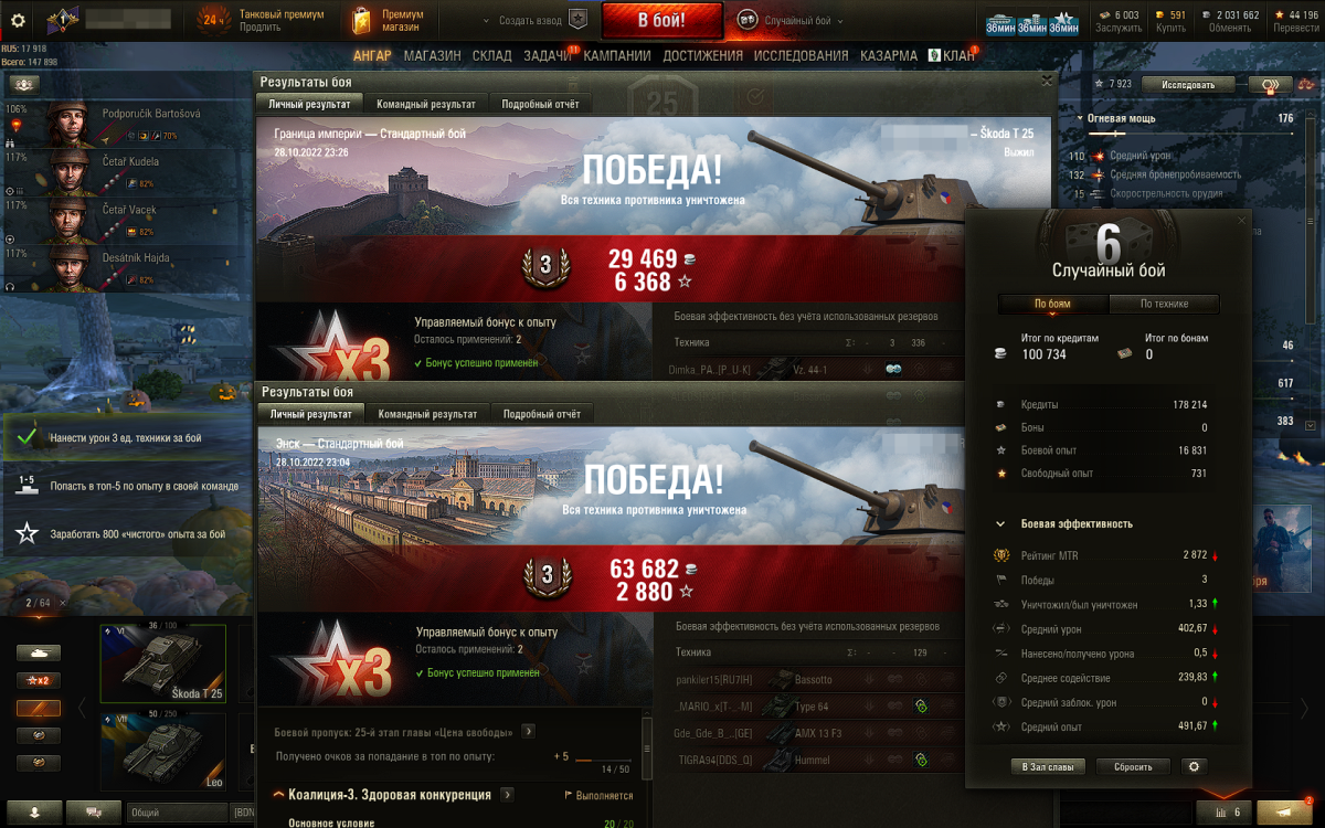 1. Опыт: 6368+2880=9248 опыта, в ангаре 7923 (опыт до сессии + опыт за 2 боя). 2. Кредиты: 29469+63682=93151, по сессии (по 2 танкам)итого по кредитам =100734, и там же "кредиты" = 178214
