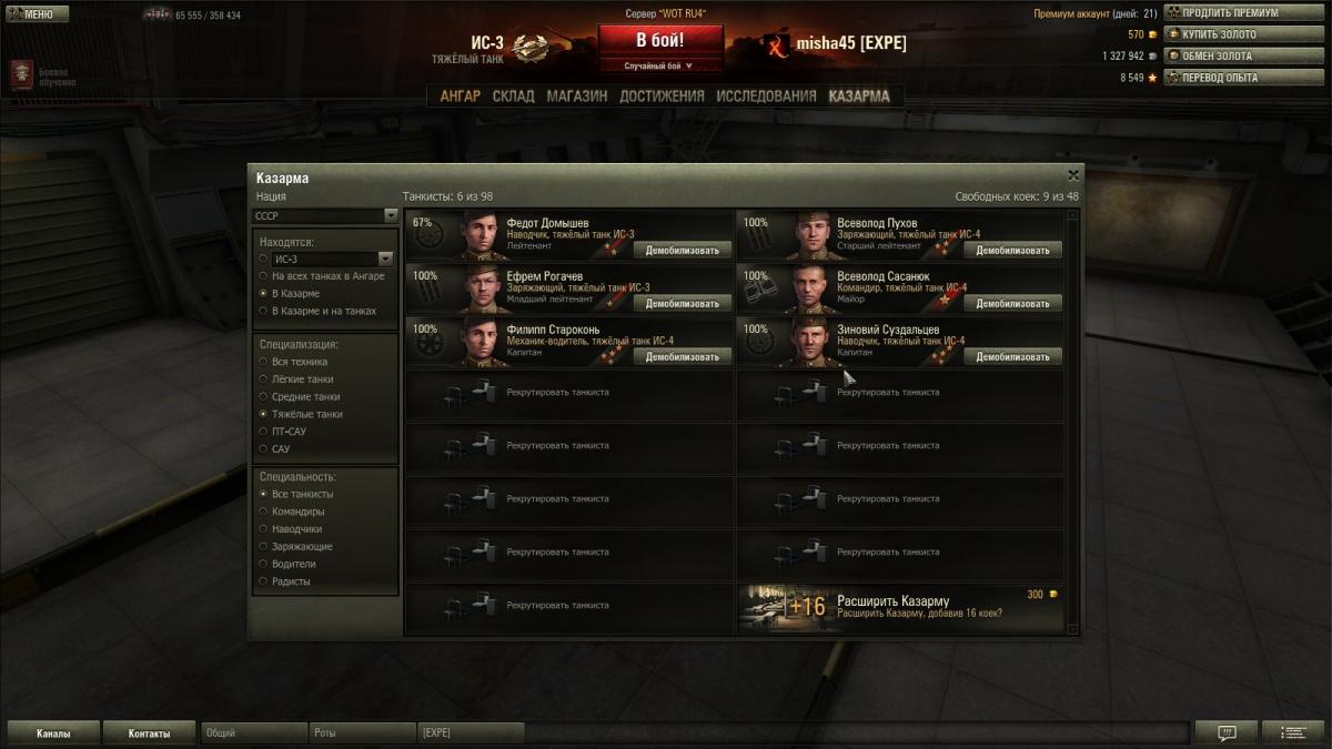 Проблема прошу помощи! Прокачивая танки продаю их а экипаж остовляю в казарме. Прошло время и соклановцы попросили купить ИС3 для ротных боев..... Купив танк не могу посадить весь экипаж т.е. Командир и Механик "садятся" а Наводчик и Заряжающий нет. Тупо сидят в казарме...... Переобучил экипаж с Т-34-85 НО хотелось бы старый экипаж т.к. там 3и перка прокачено..... Пробывал Наводчика переобучить с ИС3 все норм а в танк не "содятся"
