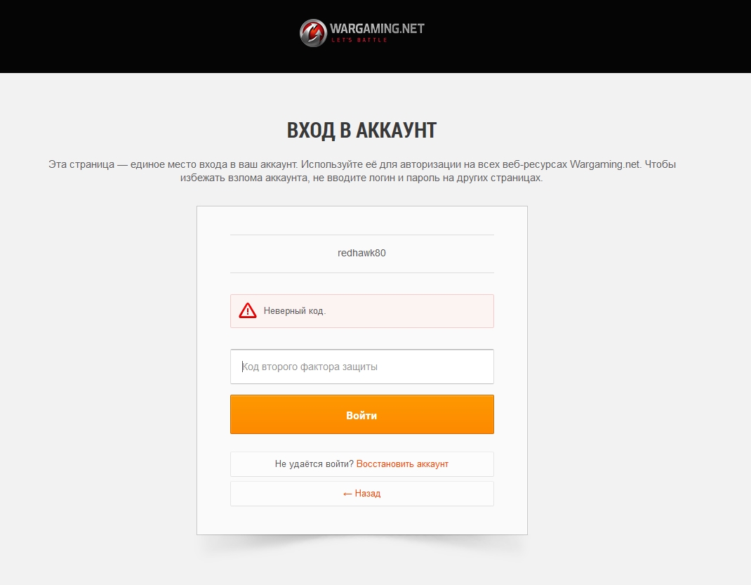 Добрый день! Подключил в субботу 24-го декабря функцию двухэтапной аутентификации с помощью google authenticator в своем личном кабинете! (все по Вашей инструкции прошло успешно и функция в ЛК стала иметь статус подключен Теперь не могу зайти в свой личный кабинет и соответственно премиум-магазин, форум и т.д. Логин и пароль работают, и в игру я тоже зайти могу! Но при входе в личный кабинет проверка логина и пароля проходят, но затем открывается окно ввода кода второго фактора защиты и я ввожу 6-значный код из программы google authenticator, которая установлена в моем телефоне, и все время пишет мне неверный код. Код обновляется в программе я ввожу новый и все равно неверный код! Как мне теперь заходить в ЛК? Я ведь даже восстановление аккаунта не могу сделать или зайти в ЛК, чтобы отключить эту функцию, т.к. система просит опять этот же код, который конечно же не верный!!! Хочу отметить, что такая система у меня уже подключена к самому аккаунту гугла (почта) и там все работает. Получается я все верно сделал! С Вашей стороны коды не принимаются почему то! Пожалуйста, ответьте побыстрее, т.к. идут новогодние акции, а я даже в премиум-магазин зайти не могу! Вот пришлом делать новый аккаунт и катать 10 боев в песке, чтобы иметь тут возможность написать вопрос! 24-го отправил с разницей 12 часов две анонимные заявки в ЦП - тишина. 25-го с нового аккаунта ( с этого написал). Тишина! Мой ник в игре: redhawk80 Доступ к почте и телефону у меня имеется. Могу любые проверки пройти с Вашей стороны. С Уважением, Алексей!