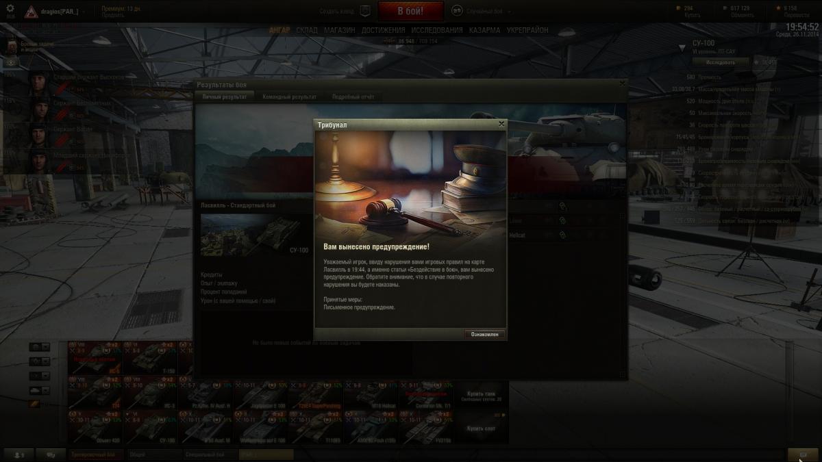 В 19-44 мне пришло предупреждение,якоби я на карте ласвиль бездействовал,но вот незадача я там даже неиграл в тот момент бил в бою на карте тихий берег,реплей скрини есть.Также у меня есть реплеи за месяц готов любой предоставить администрации если они думают что я когда либо бездействовал.Просмотрел все реплеи за три дня до того так и ненашол ласвиля в то время(допустим если в жалобе время нетак указано пусть скажут каой реплей нуже залю,ато била уже такая тема на форуме без реплея так сразу сказали что он виноват система жалоб права).Ссилка на реплей присутсвует именно в то время что указано в предупреждении(сори если кому лень переходить по ссилке)http://wotreplays.ru/site/4088941#tihiy_bereg-dragios-su-100