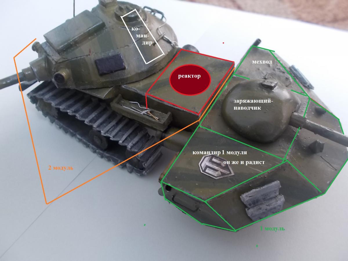 Хорошо завтра сделаю))) а реактивные двигатели... это обычные колеса от ис-3 с дырочкой в центре я же говорю фантазия Сам реактор был немного смещен к главной башни, поэтому во время стоянки он не падал. А насчет тесноты. не повернуться было только в главной башне,а в 1 модуле было просторно из за лежачего положения командира и мехвода. Бронирование такое же как и у ИС-3 (в некоторых местах даже меньше) только главная башня немного улучшена в броне. И насчет замечаний и критики, пишите таких загвоздочек побольше, люблю на них отвечать