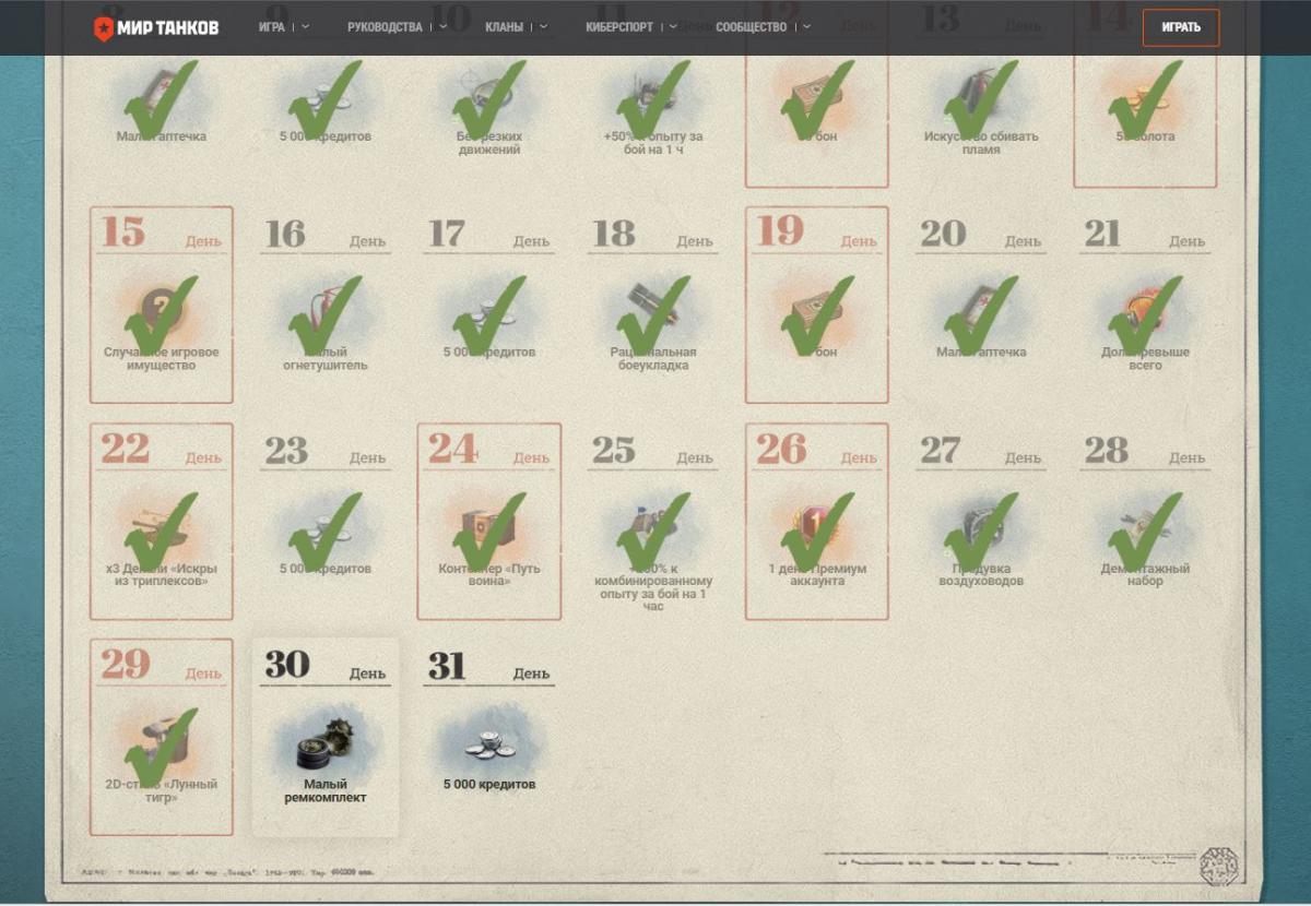 Ха! У меня другой прикол с календарём. Весь месяц заходил, кроме одного дня (но речь не об этом), у меня на тридцатом числе был нарисован новогодний контейнер. Ну, пропустил день, думаю тридцать первого получу зайду. Захожу тридцать первого, а там ***, вернее малый ремкомплект. Вот этот прикол я не понял. Объясните. https://forum-mt-prod.lesta.ru/monthly_12_2024/post-7612824-0-86273400-1735686441_thumb.jpg Да и из "лунных" стилей у меня только "Лунный свет" и "Лунный пряник". Никаких "Лунных тигров" нет. Походу это уже январский календарь подставился под декабрьские отметки. И, да, Новогодний контейнер присутствует на складе. Всех с наступившим!